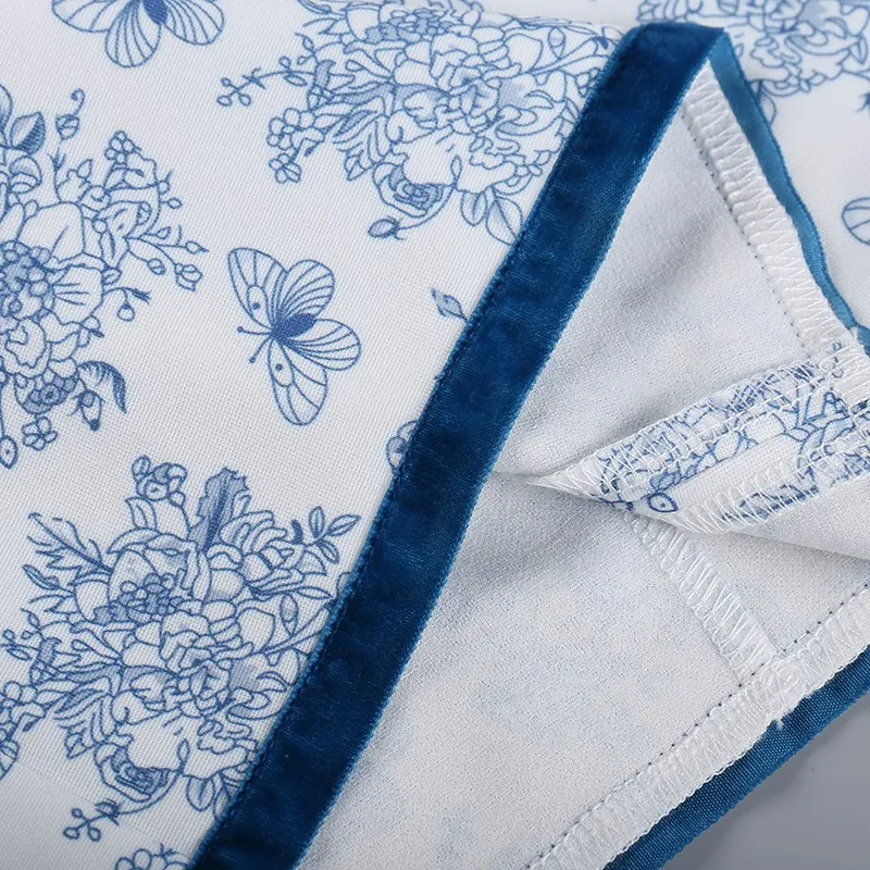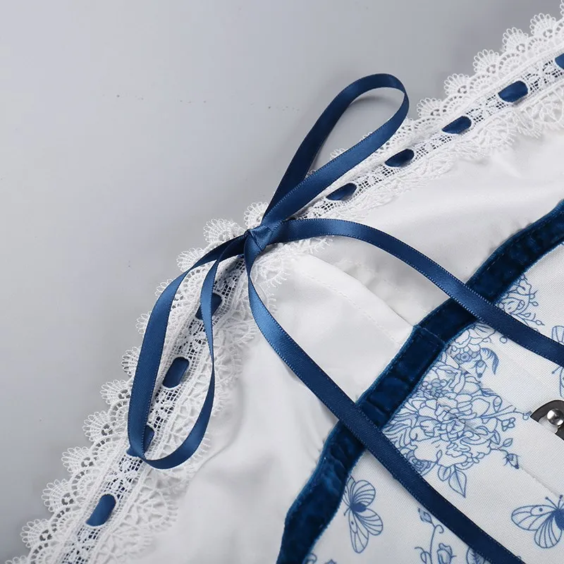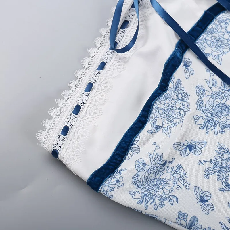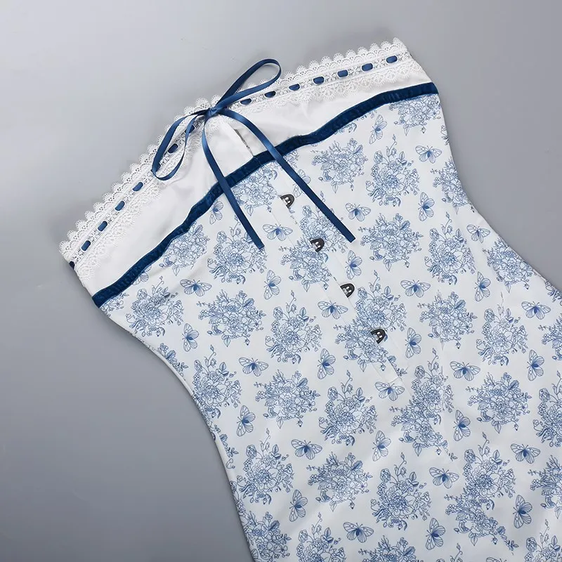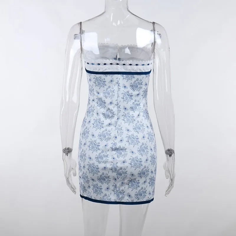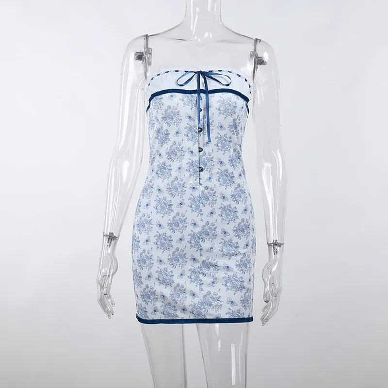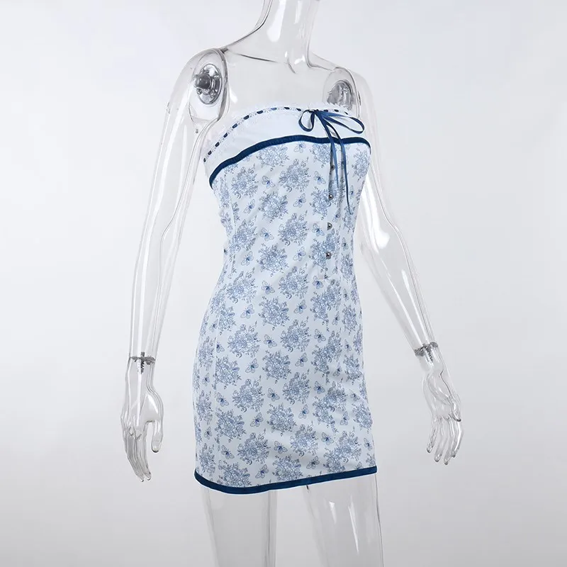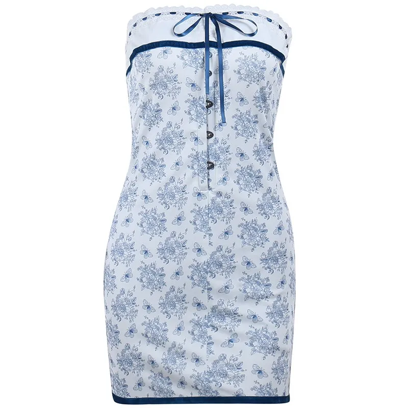 Fleepmart Sexy Vintage Contrast Blue Floral Tube Dress Women Bow Dress Korean Fashion Backless Beach Travel Casual Vestidos New