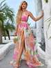 Fleepmart Sexy White Deep V-Neck Printed Backless Hollow Sleeveless Split Chiffon Spring Summer Maxi Dress