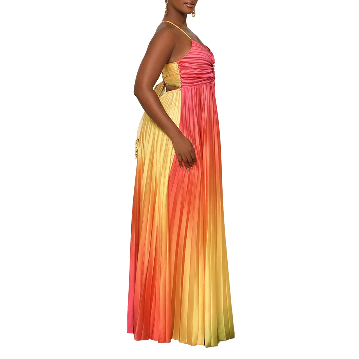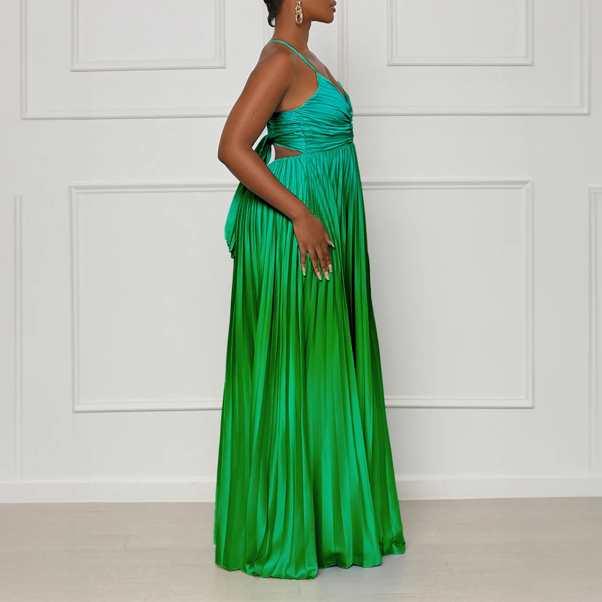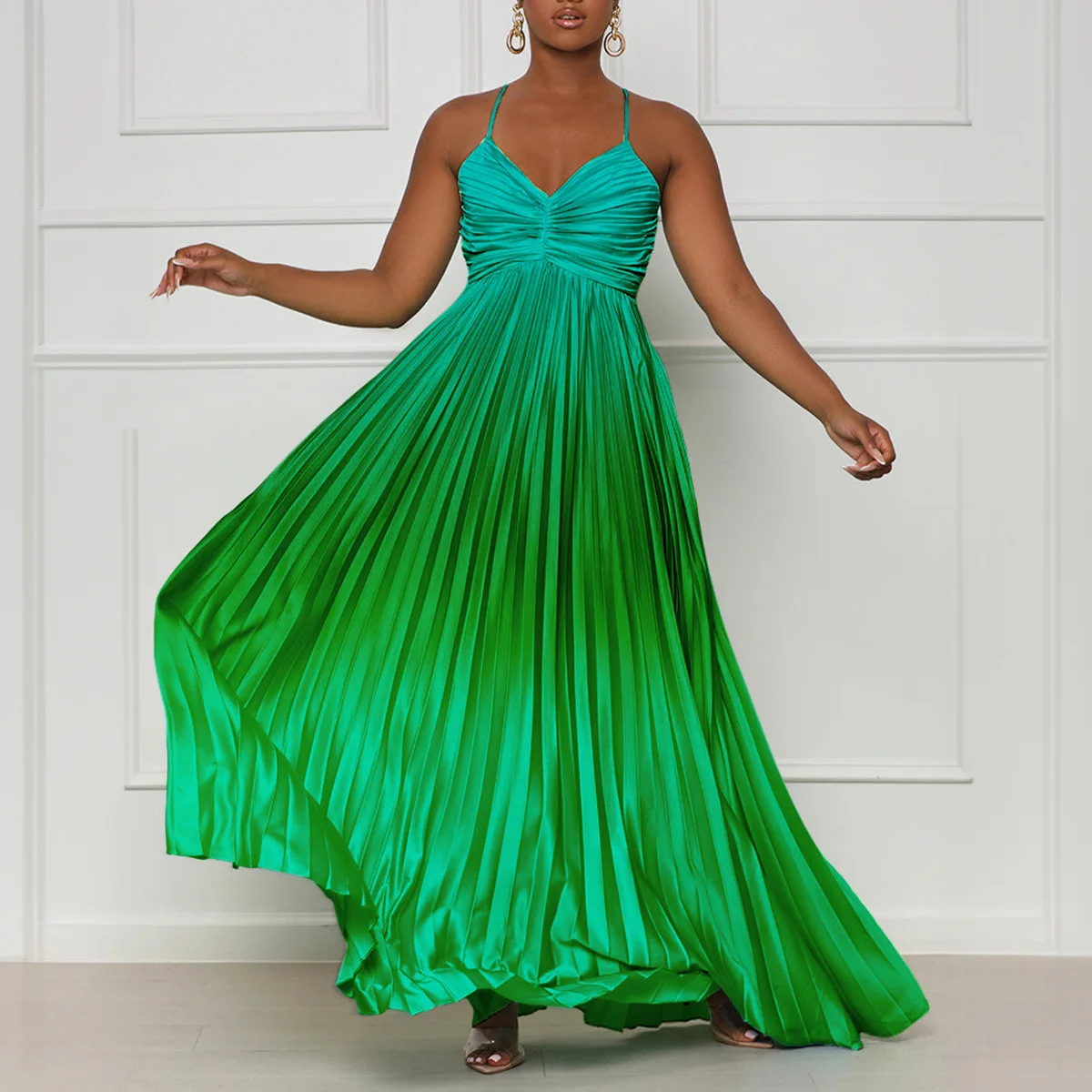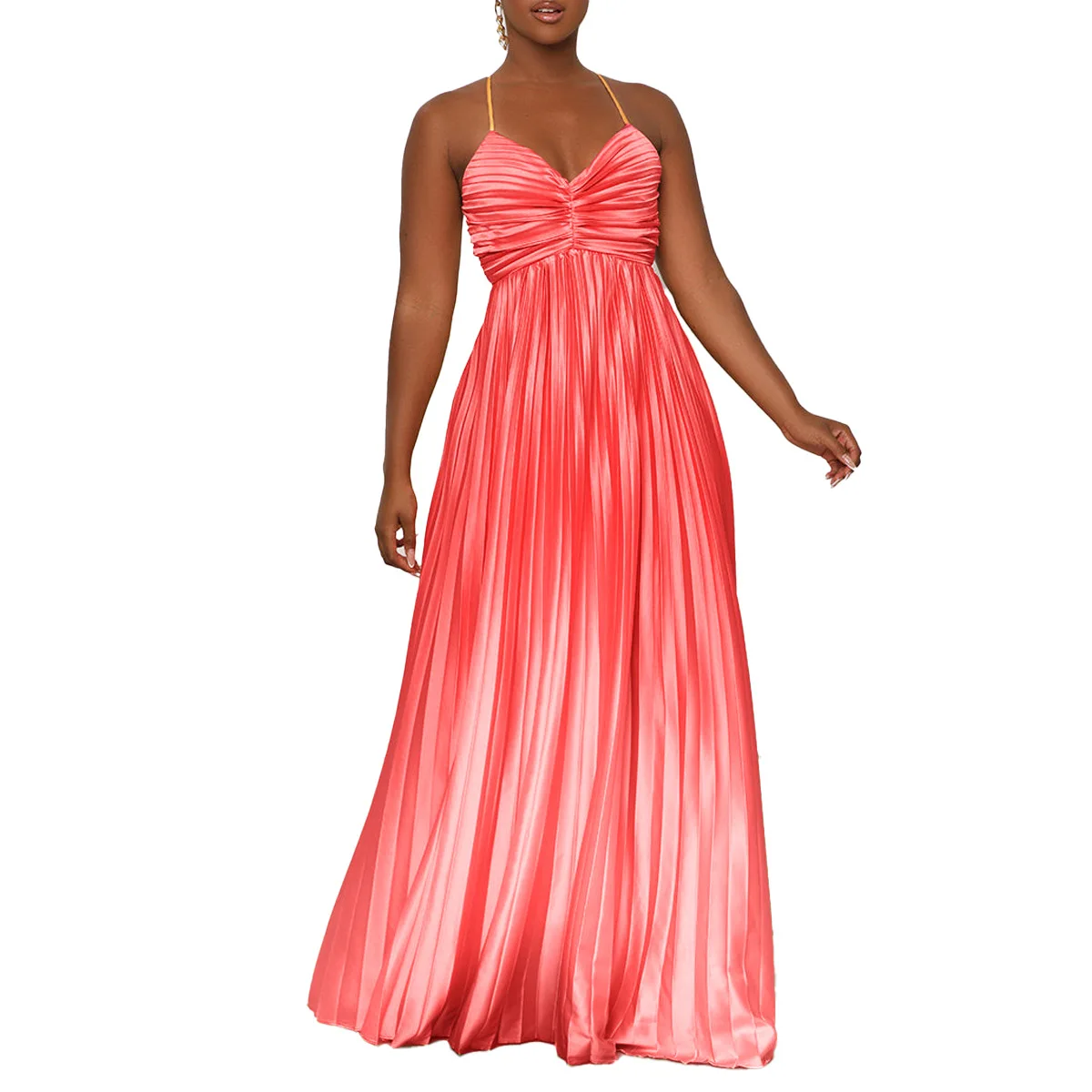 Fleepmart Sexy Women Color Block Spaghetti Strap Backless Evening Cocktail Party Dress Floor-Length Pleated Chic Gown Big Size Summer New