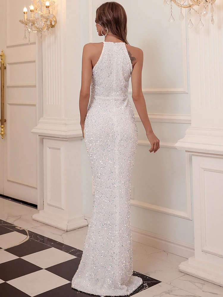 Fleepmart Shinning Sequins Evening Party Dress Sleeveless High Neck Slim Side Split Gown Robe Sexy Vestidoes Prom Dress
