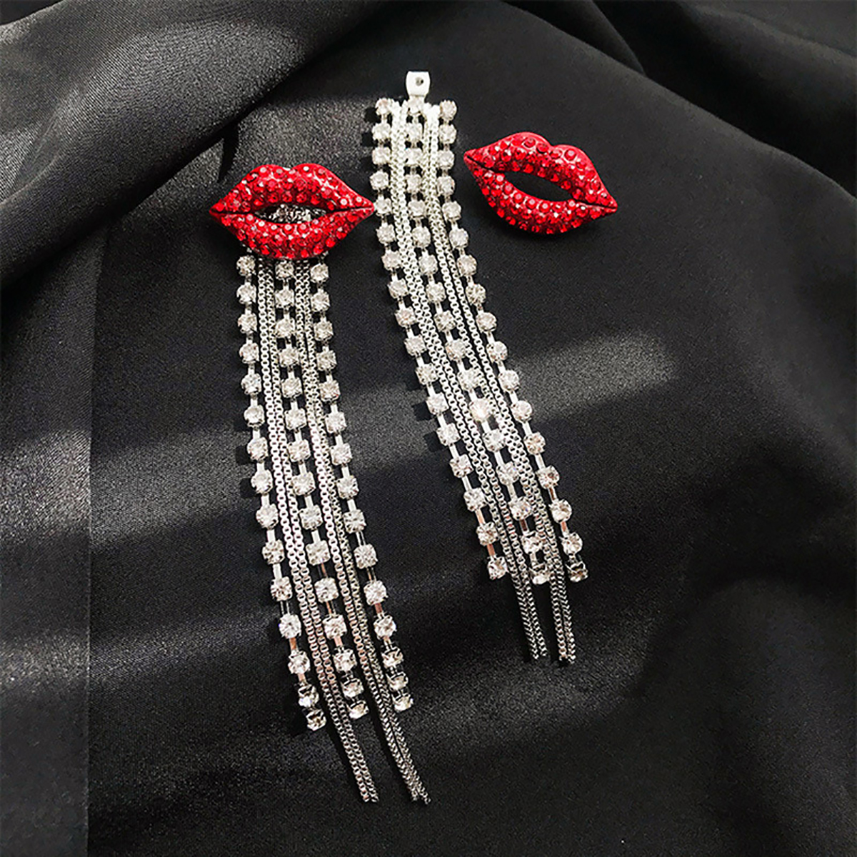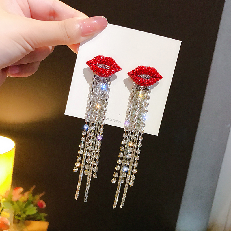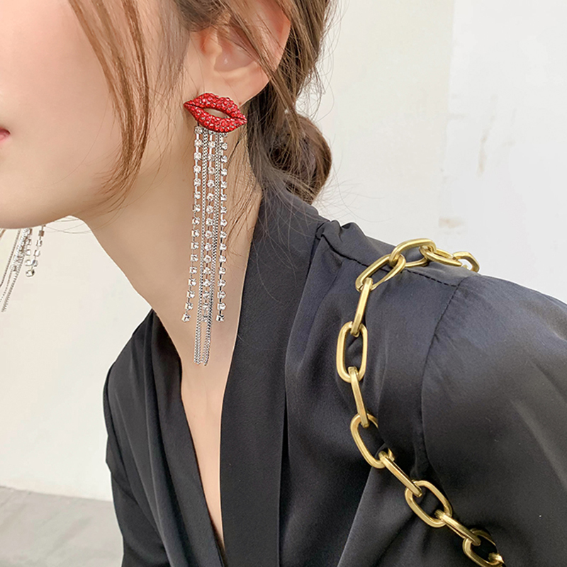 fleepmart Shiny Full Crystal Red Lip Long Tassel Drop Earring Vintage Rhinestone Chain Earrings for Women Party Jewelry