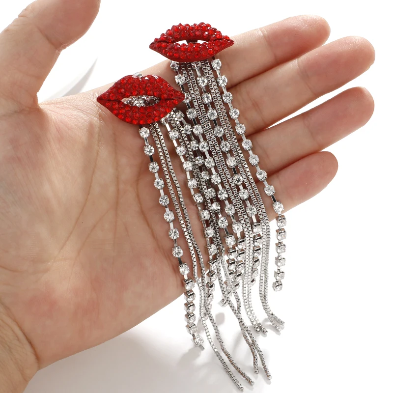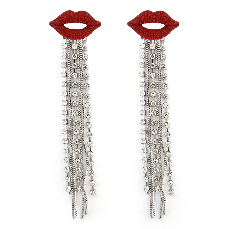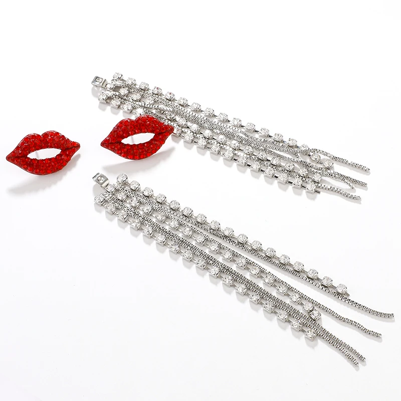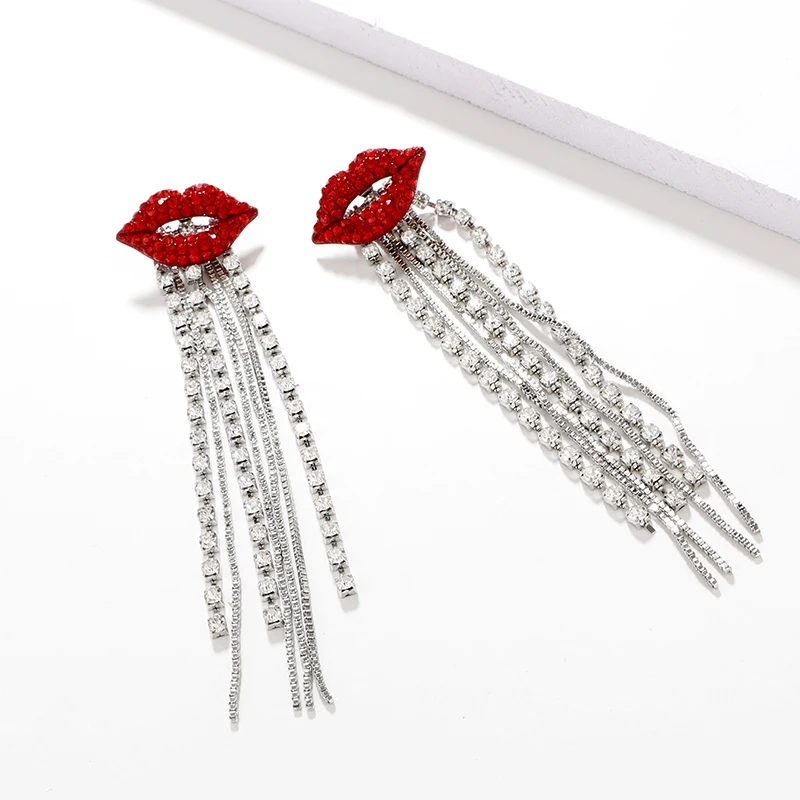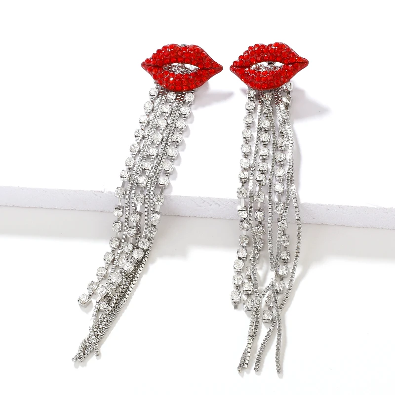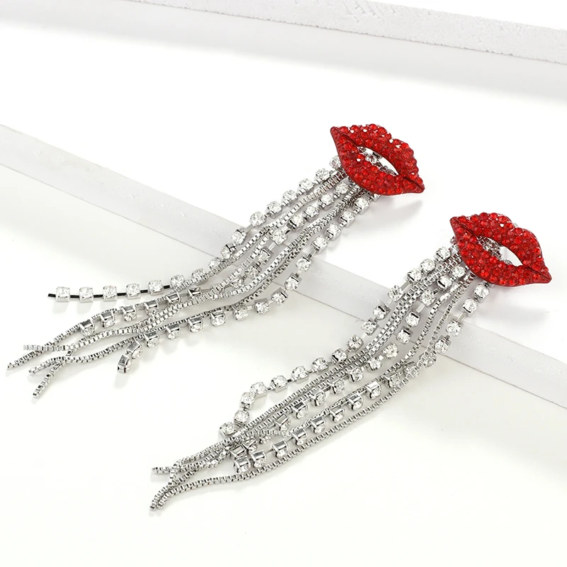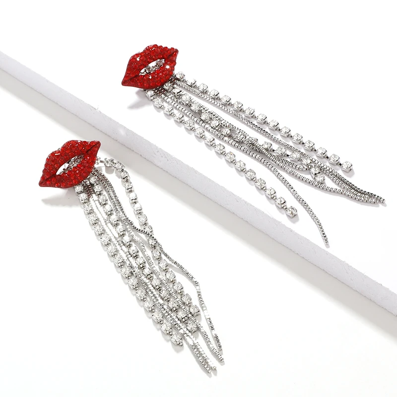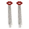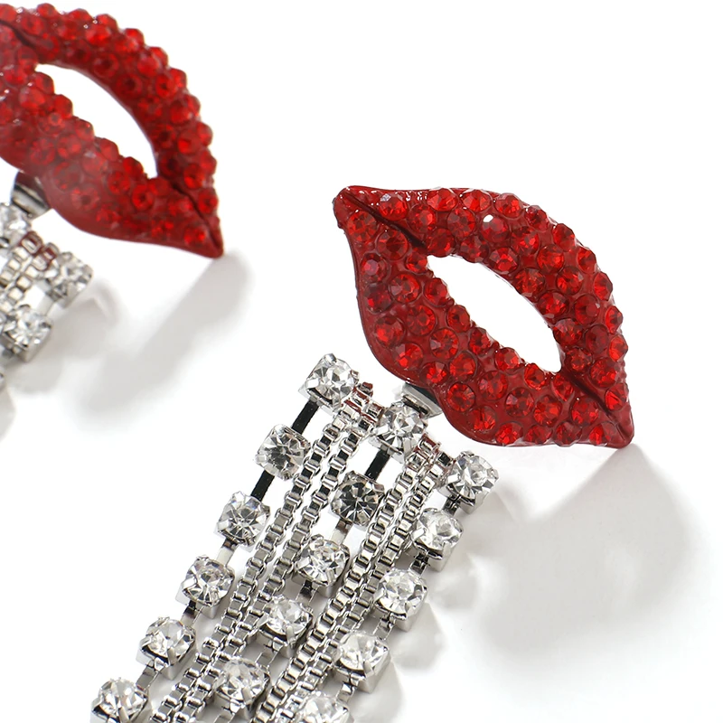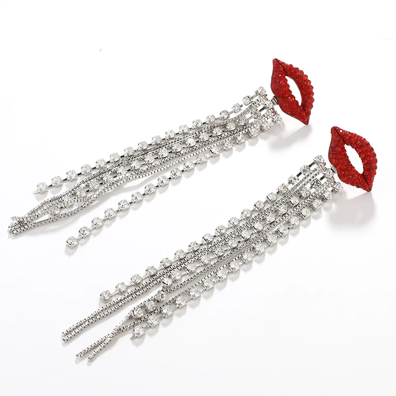 fleepmart Shiny Full Crystal Red Lip Long Tassel Drop Earring Vintage Rhinestone Chain Earrings for Women Party Jewelry