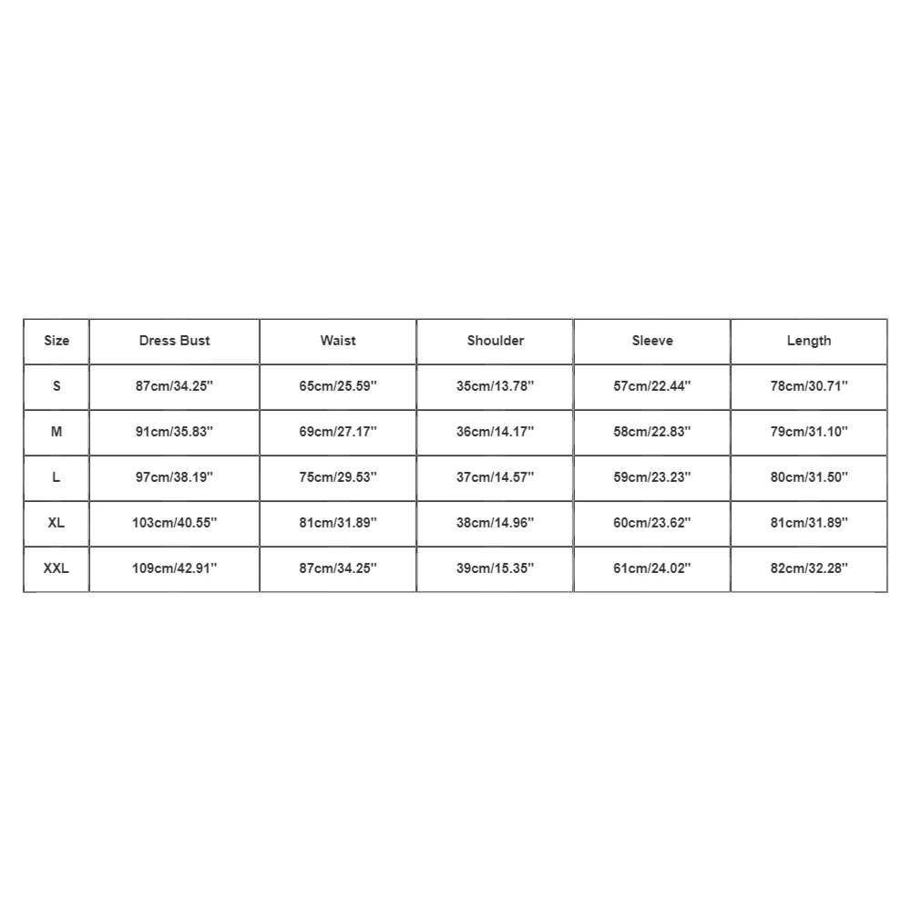 Size:XL Dress Bust:103cm/40.55” Waist:81cm/31.89” Shoulder:38cm/14.96” Sleeve:60cm/23.62” Length:81cm/31.89”