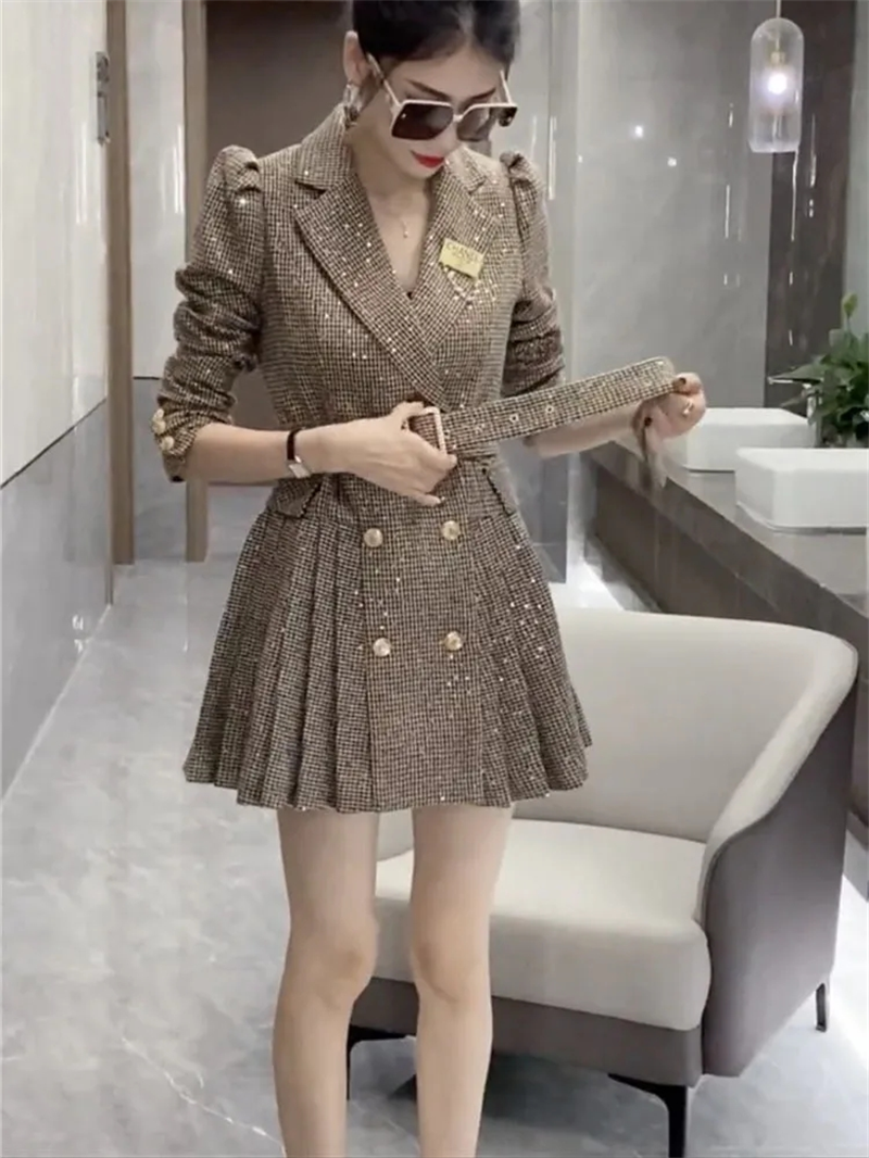 Fleepmart Short Suit Women Autumn European Style Bubble Sleeves High Waist Slimming Pleated Dress