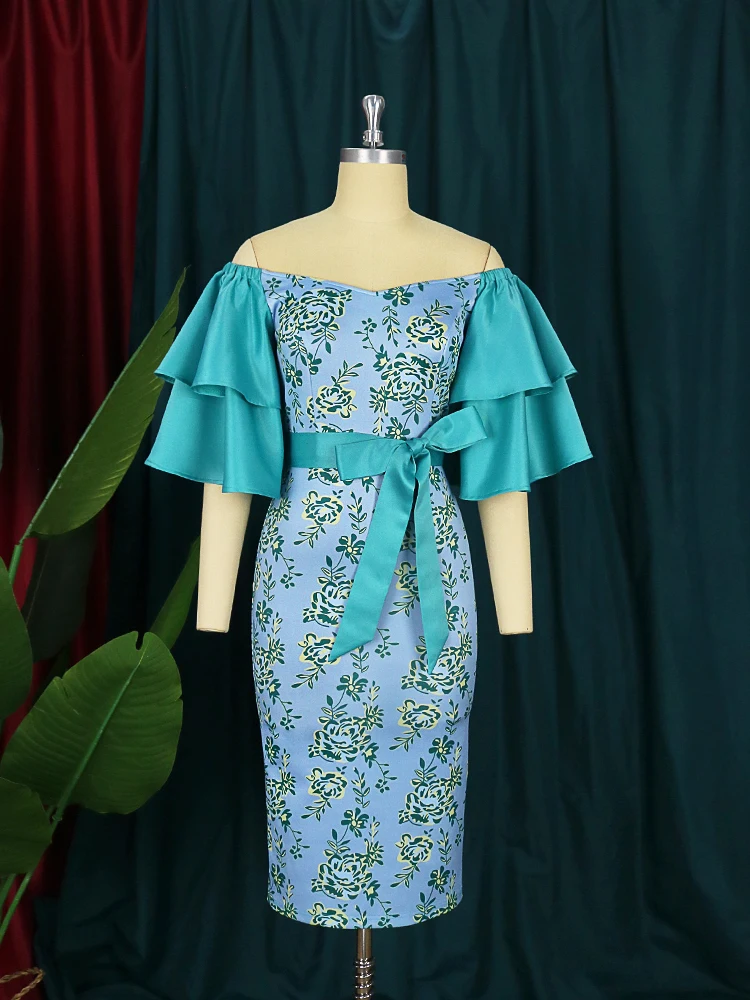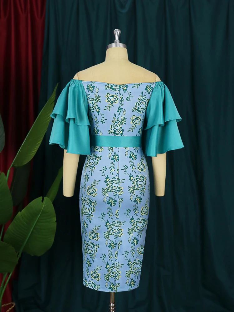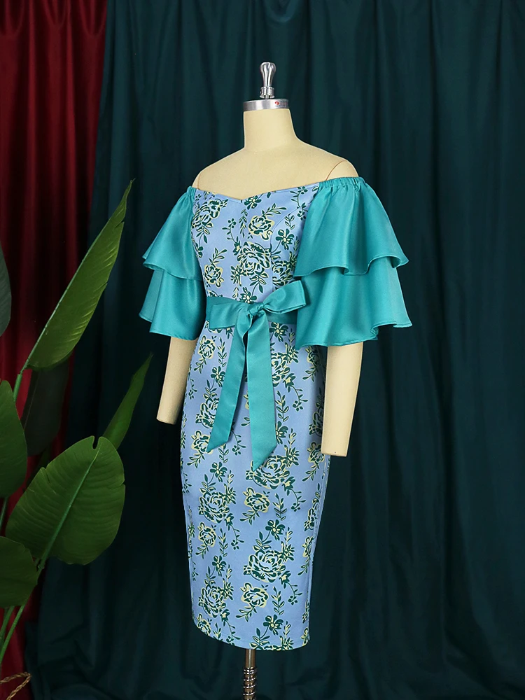 Fleepmart Shoulder Printed Dresses Green Ruffles Sleeve Bodycon Patchwork African Gowns Evening Cocktail Clubwear Party Outfits