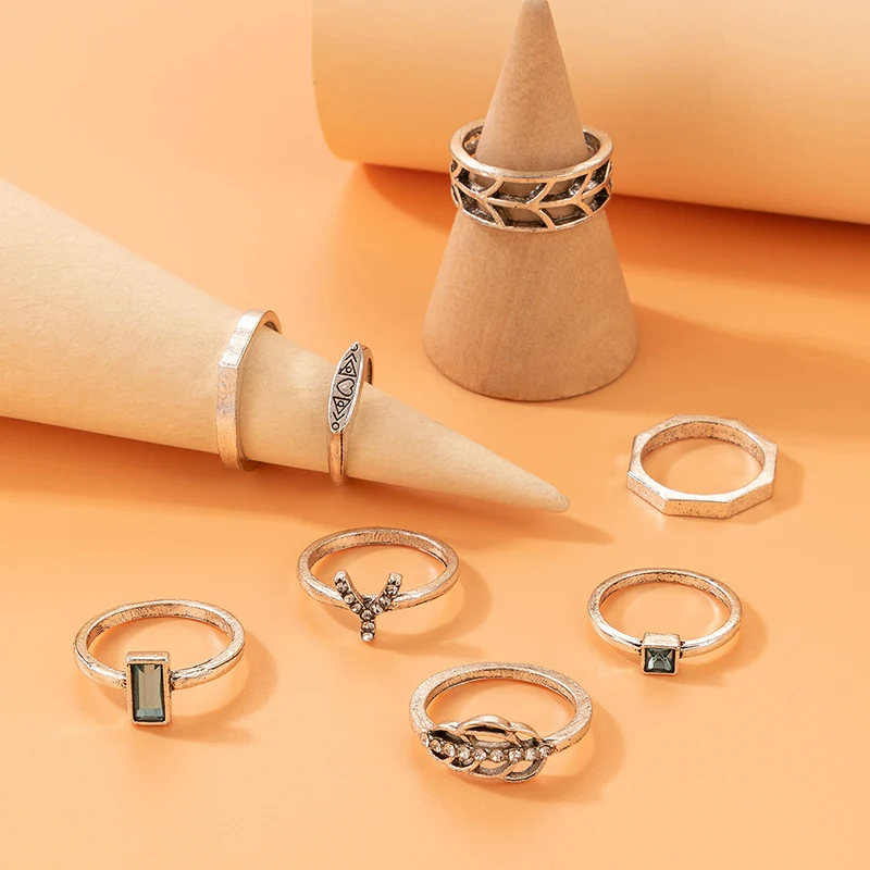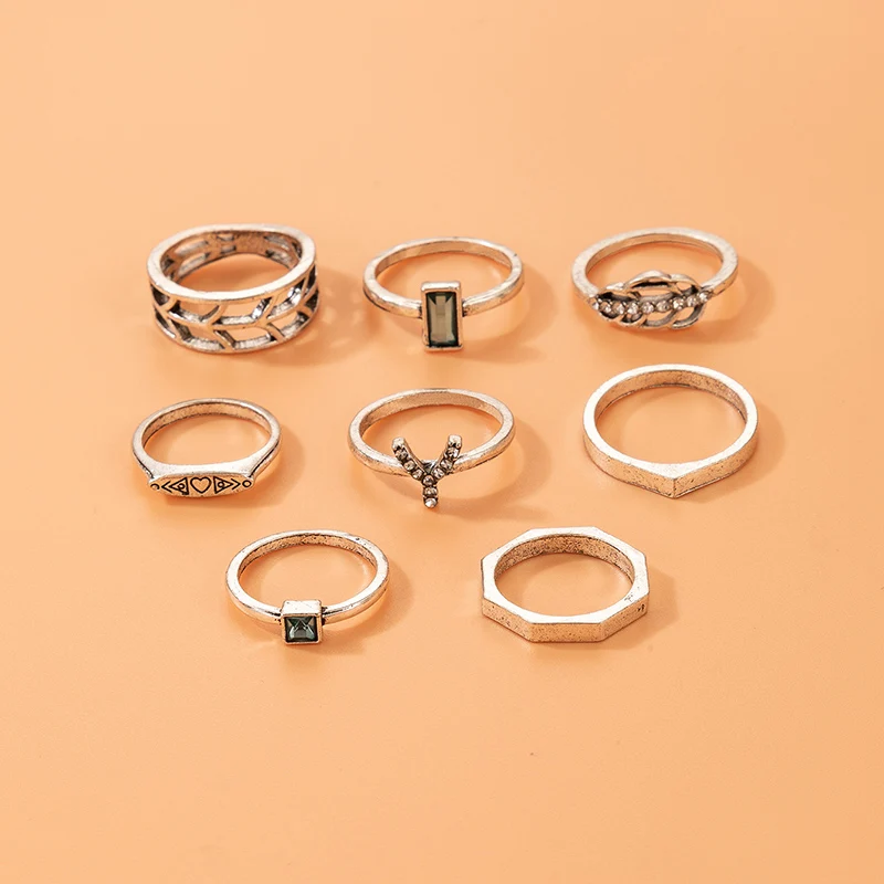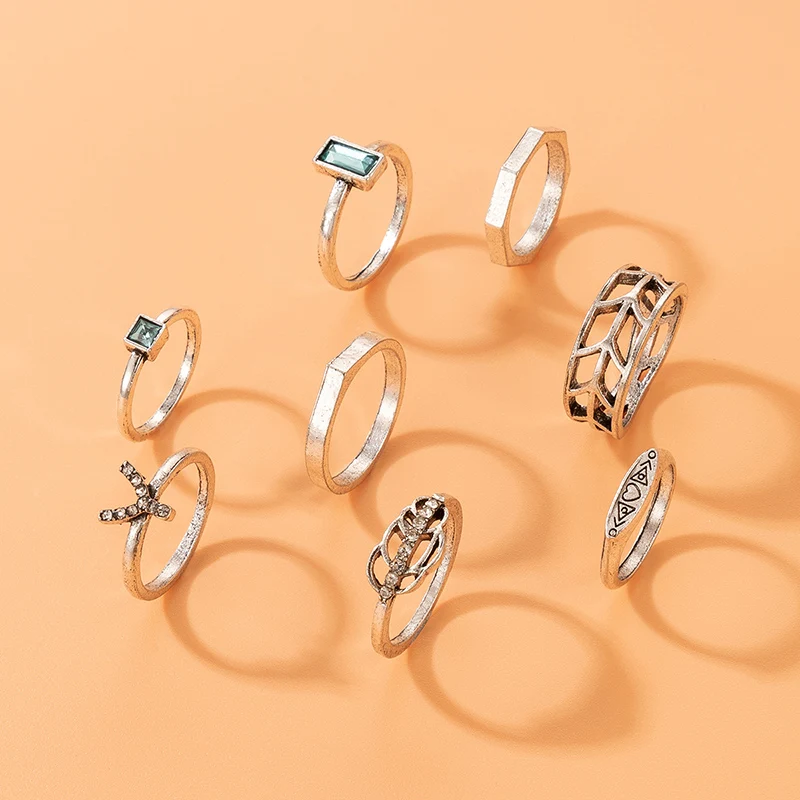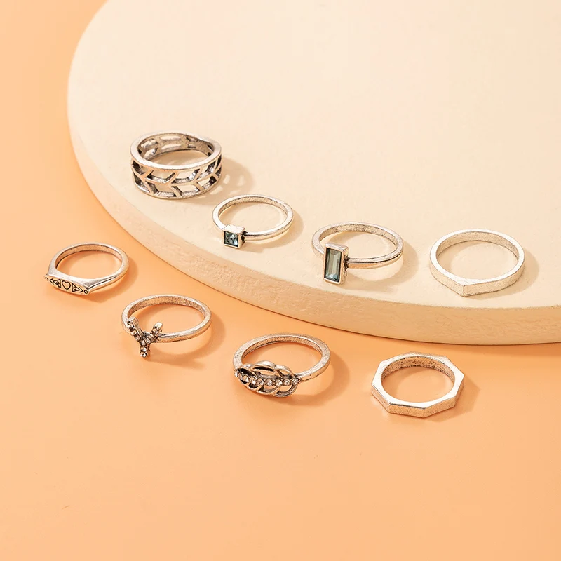 Fleepmart Simple Style Clear Rhinestone Joint Ring Sets Charms Flowers Geometry for Women Men Jewelry 8pcs/sets