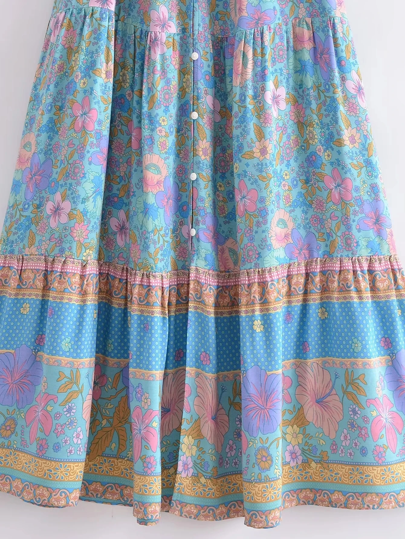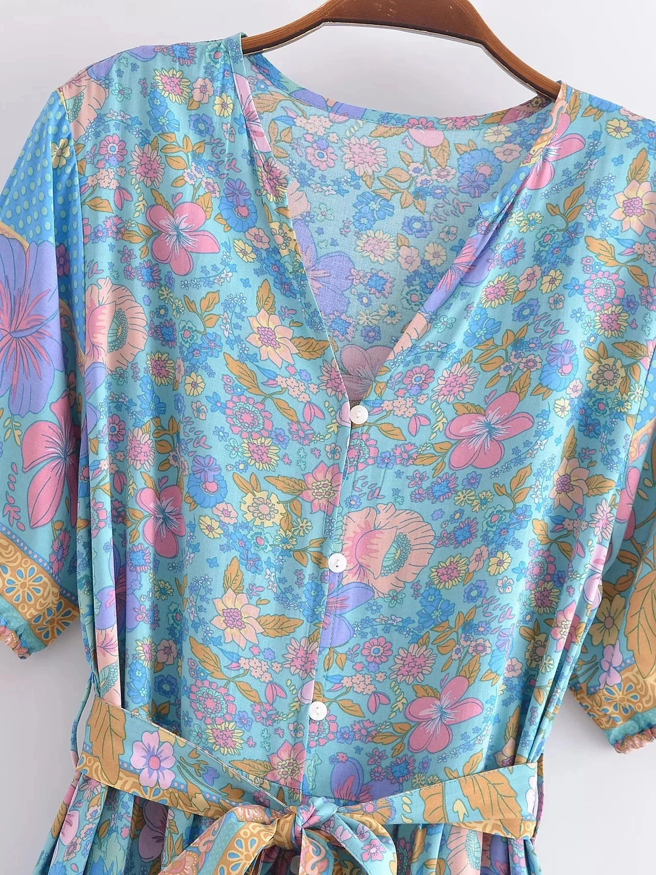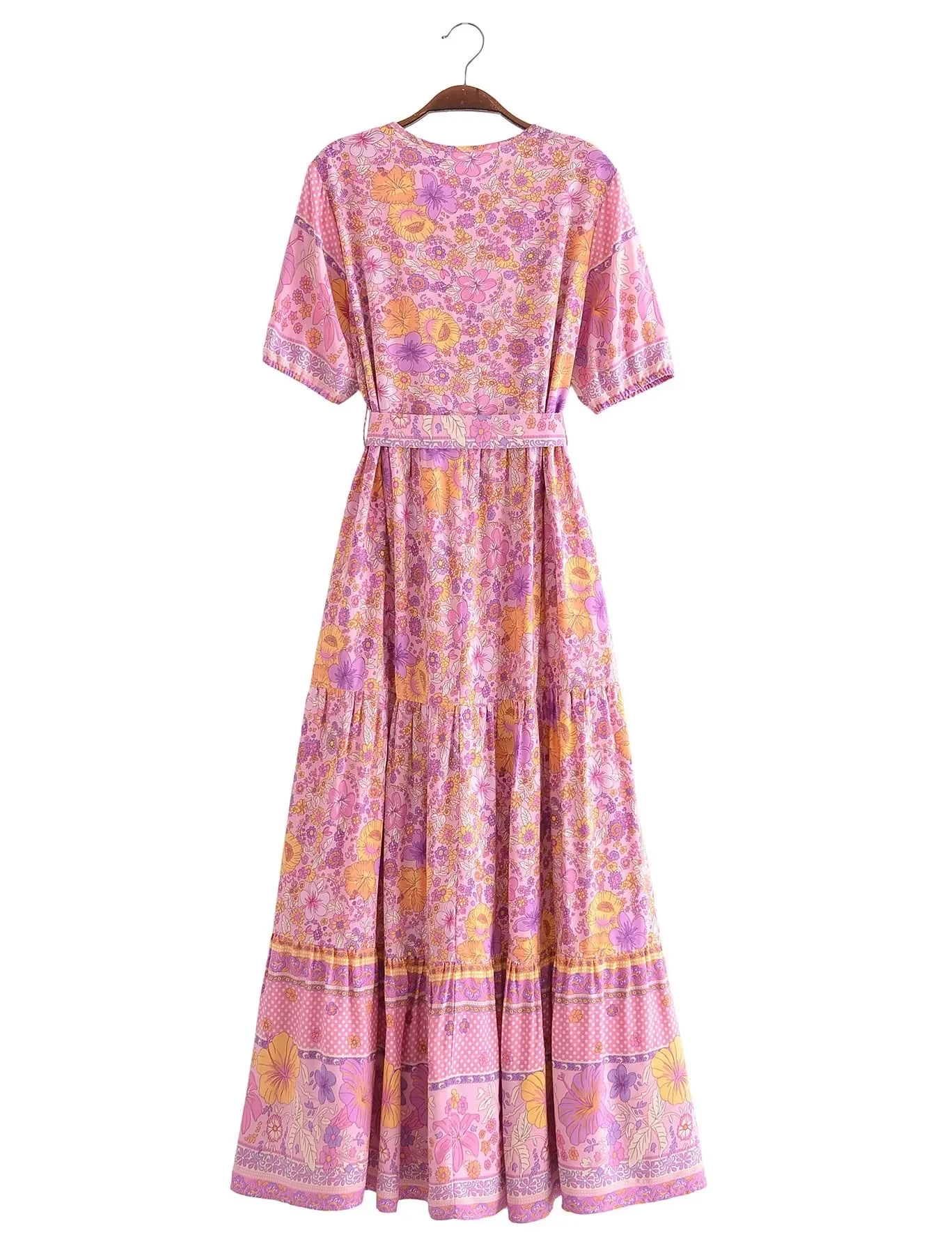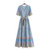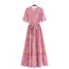 Fleepmart Single Breasted Bohemian Holiday Summer Women Dress Belt Casual Loose Maxi Floral Dress Short Sleeve Long Viscose Dress