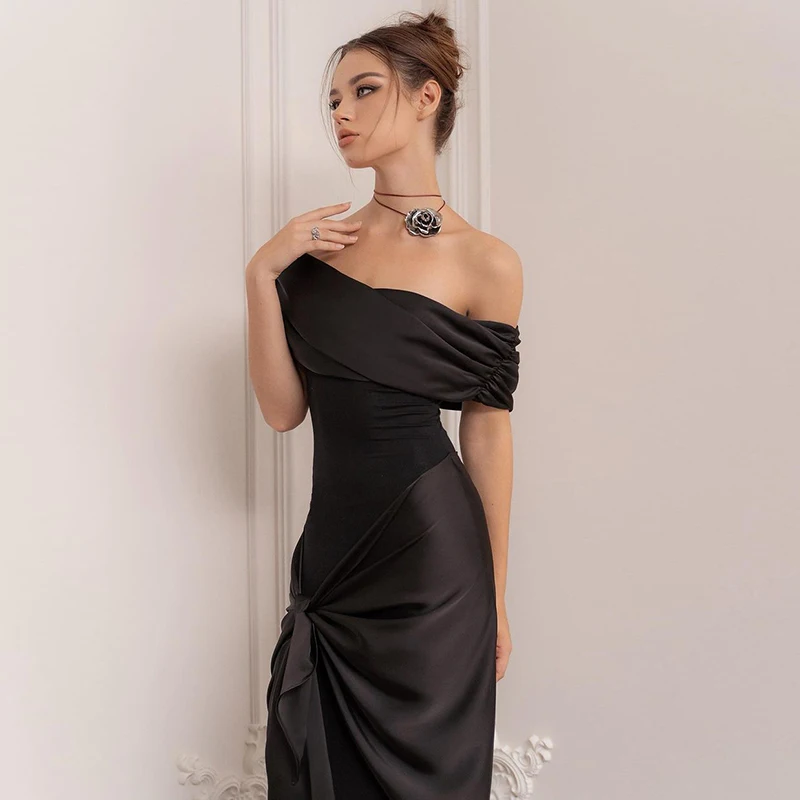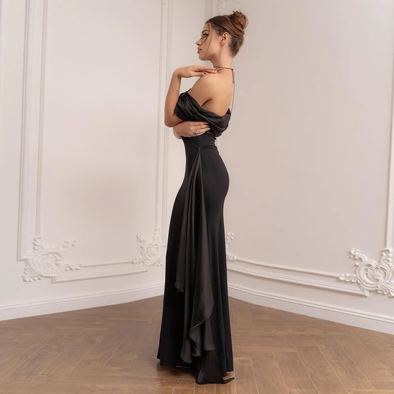 Fleepmart Single Shoulder Mesh Formal Dress European And American New Style Slim Fit Black Long Dress For Women