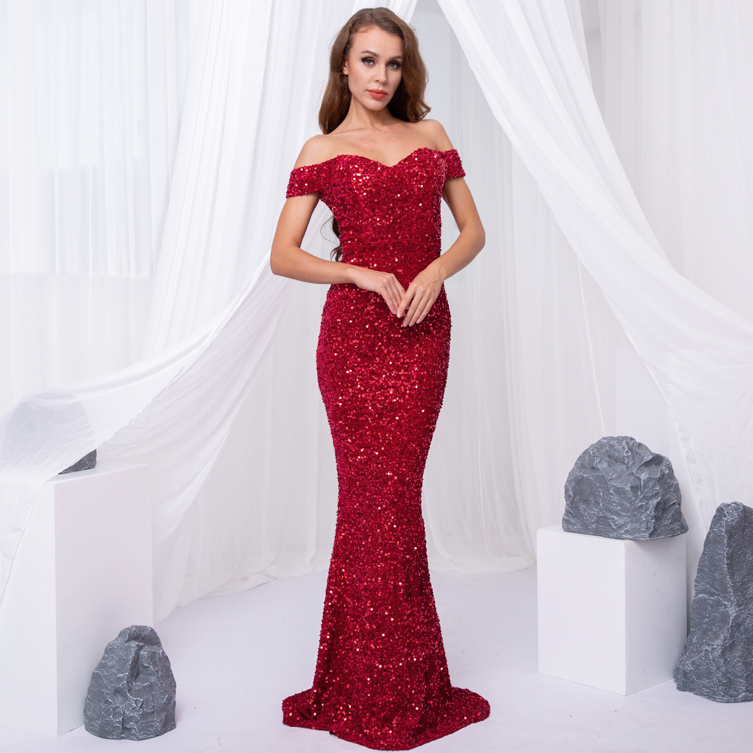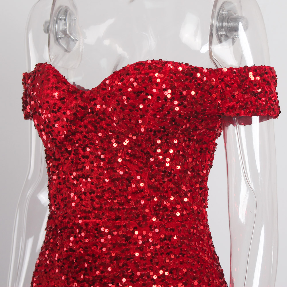 Fleepmart Slash Neck Stretch Sparkle Sequin Long Party Dress Off the Shoulder Sleeveless Floor Length Evening Gown Red Sky Blue