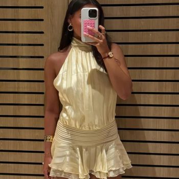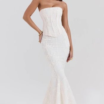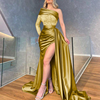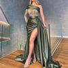 Fleepmart Slim Dress with Girdle Sequin Long-sleeved One-shoulder Golden Evening Banquet Host Party Gown Diagonal Collar Floor-length Robe