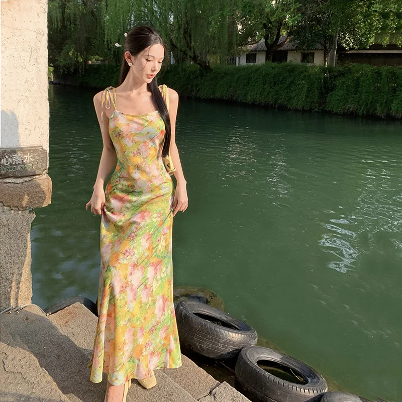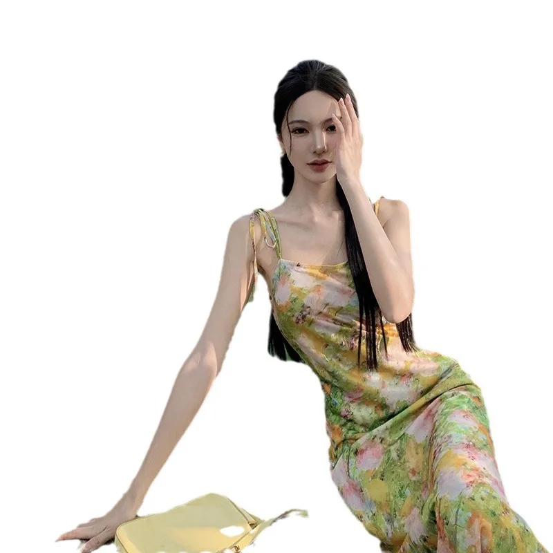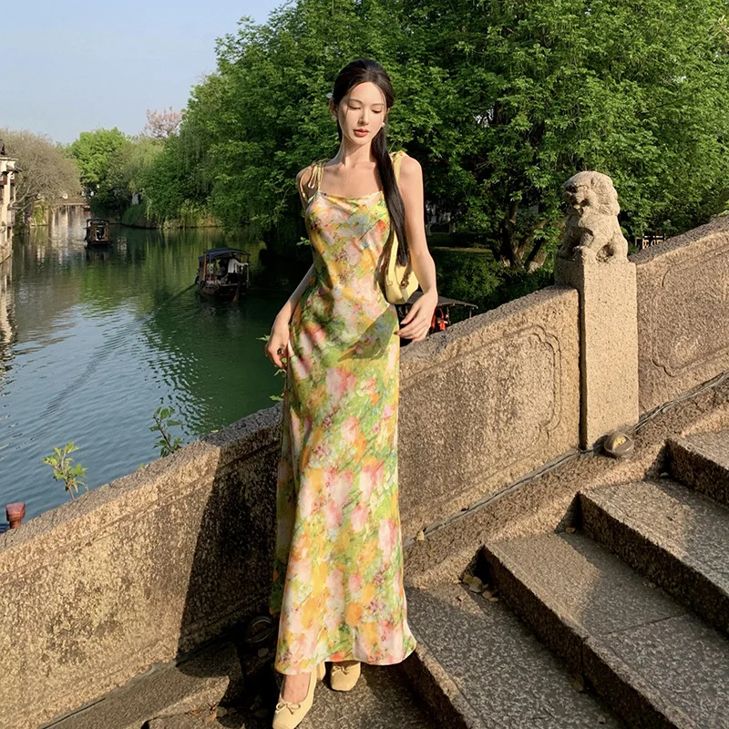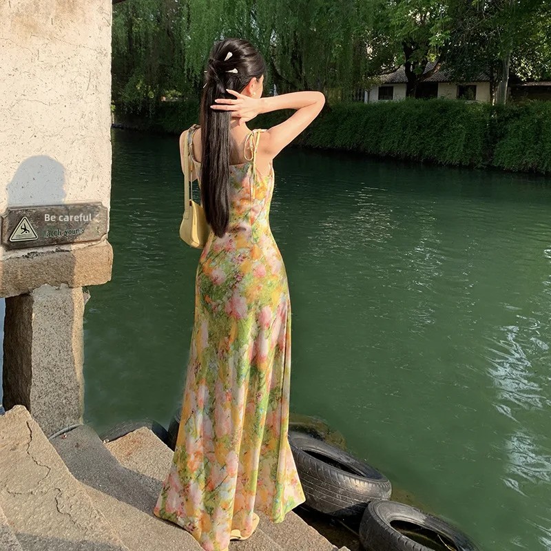 Fleepmart Slimming Artistic Long Tank Dress Oil Painting Patterned Satin Fabric Travel Photography Attractive Dress