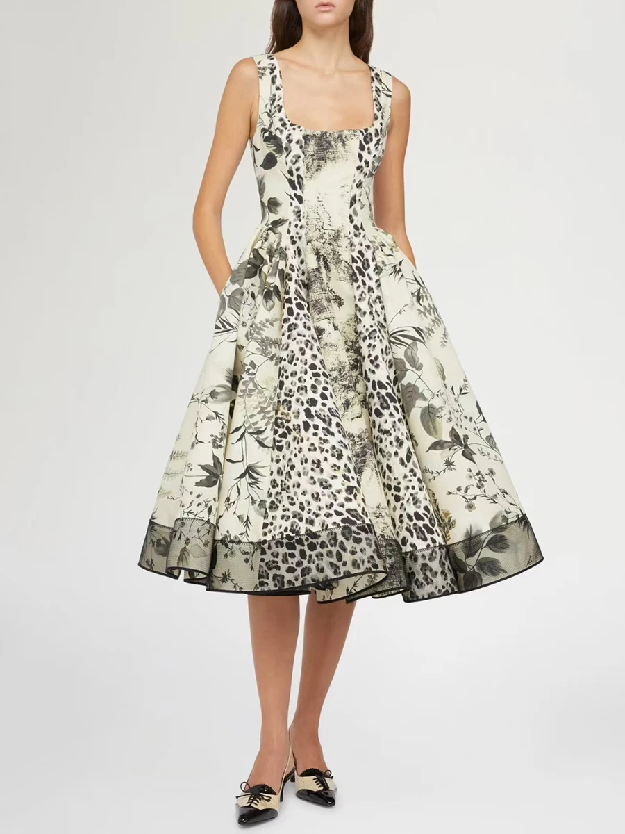 Fleepmart Slimming Printing Spliced Leopard Fashion Dresses for Women Square Neck Sleeveless High Waist Dress Female Clothingepmart