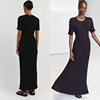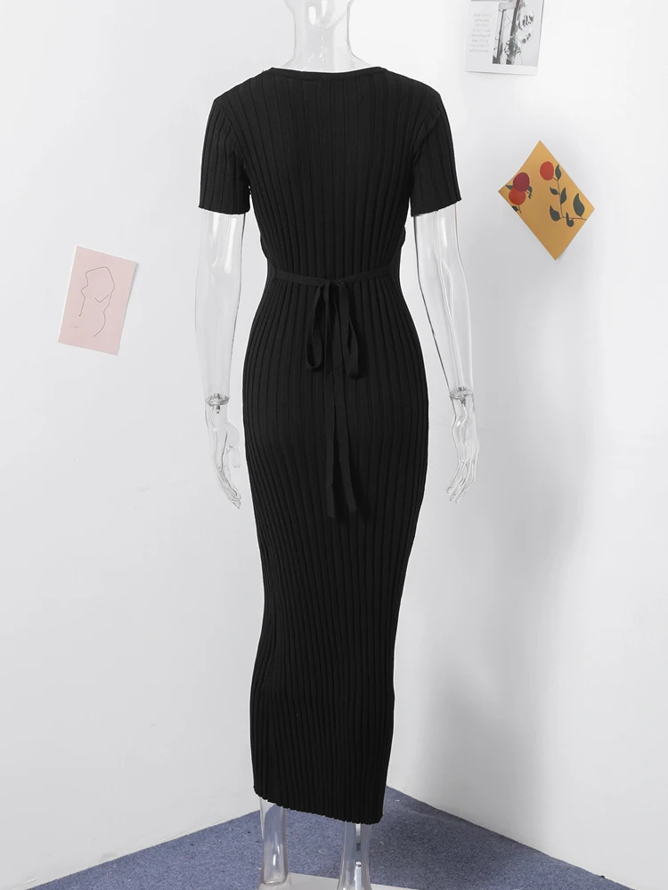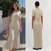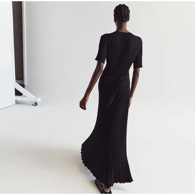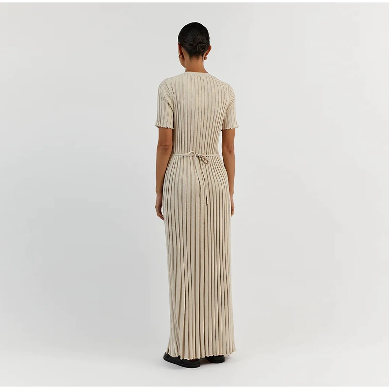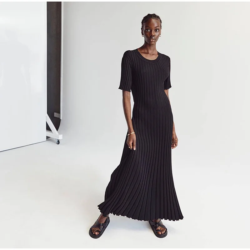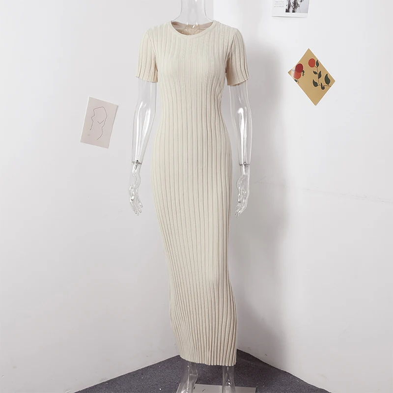 Fleepmart Solid Knitted Women Long Dress Short Sleeve Pleated Lady Dresses 2024 Fashion Spring Summer Hip Package O Neck Female Vestidos