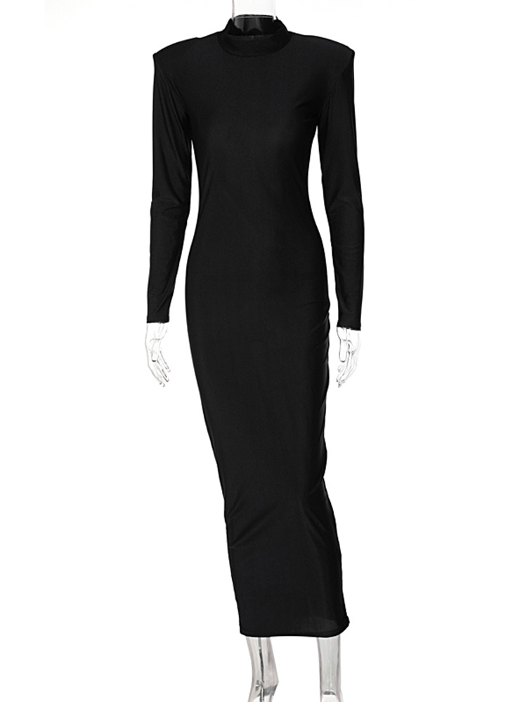 Fleepmart Solid Long Sleeve With Shoulder Pads Turtleneck Maxi Dress 2024 New Year Women Fashion Streetwear Elegant Skinny