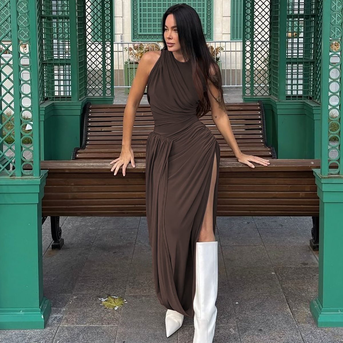 Fleepmart Solid O Neck Sleeveless Ruched Slit Sexy Elegant Bodycon Maxi Dress 2025 Spring Women Y2K Clothes Party Vacation