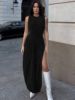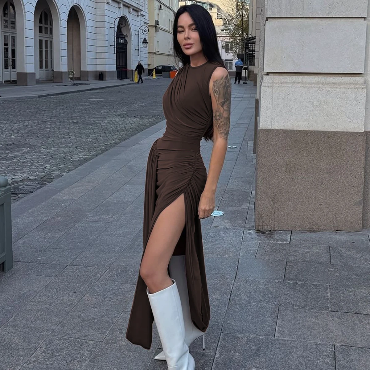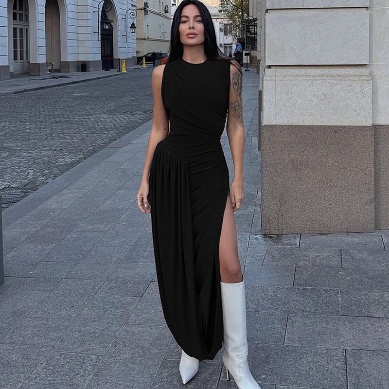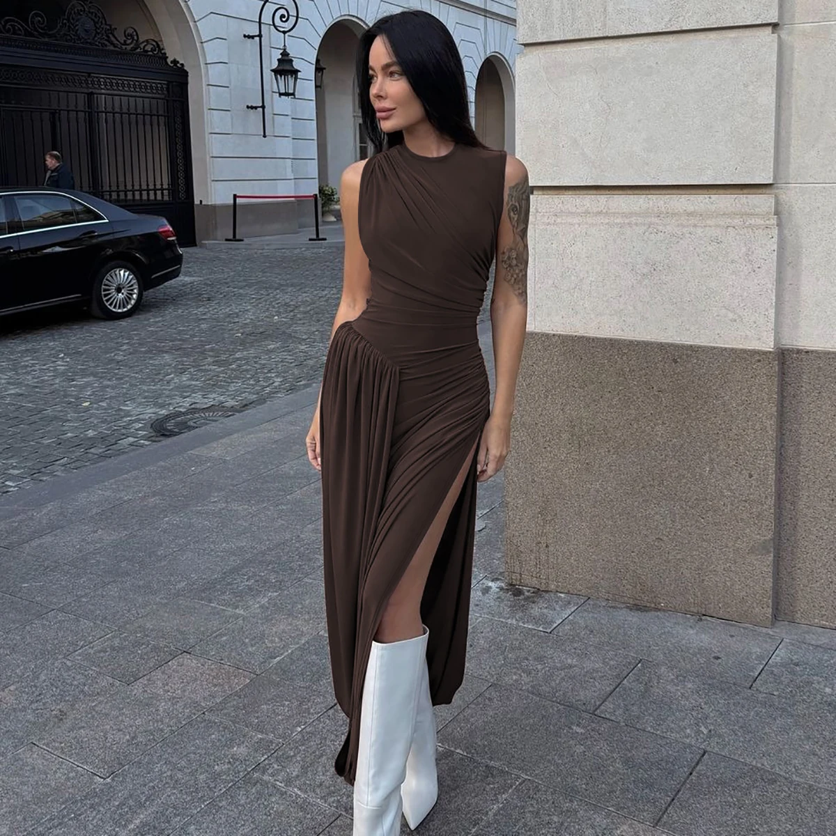 Fleepmart Solid O Neck Sleeveless Ruched Slit Sexy Elegant Bodycon Maxi Dress 2025 Spring Women Y2K Clothes Party Vacation