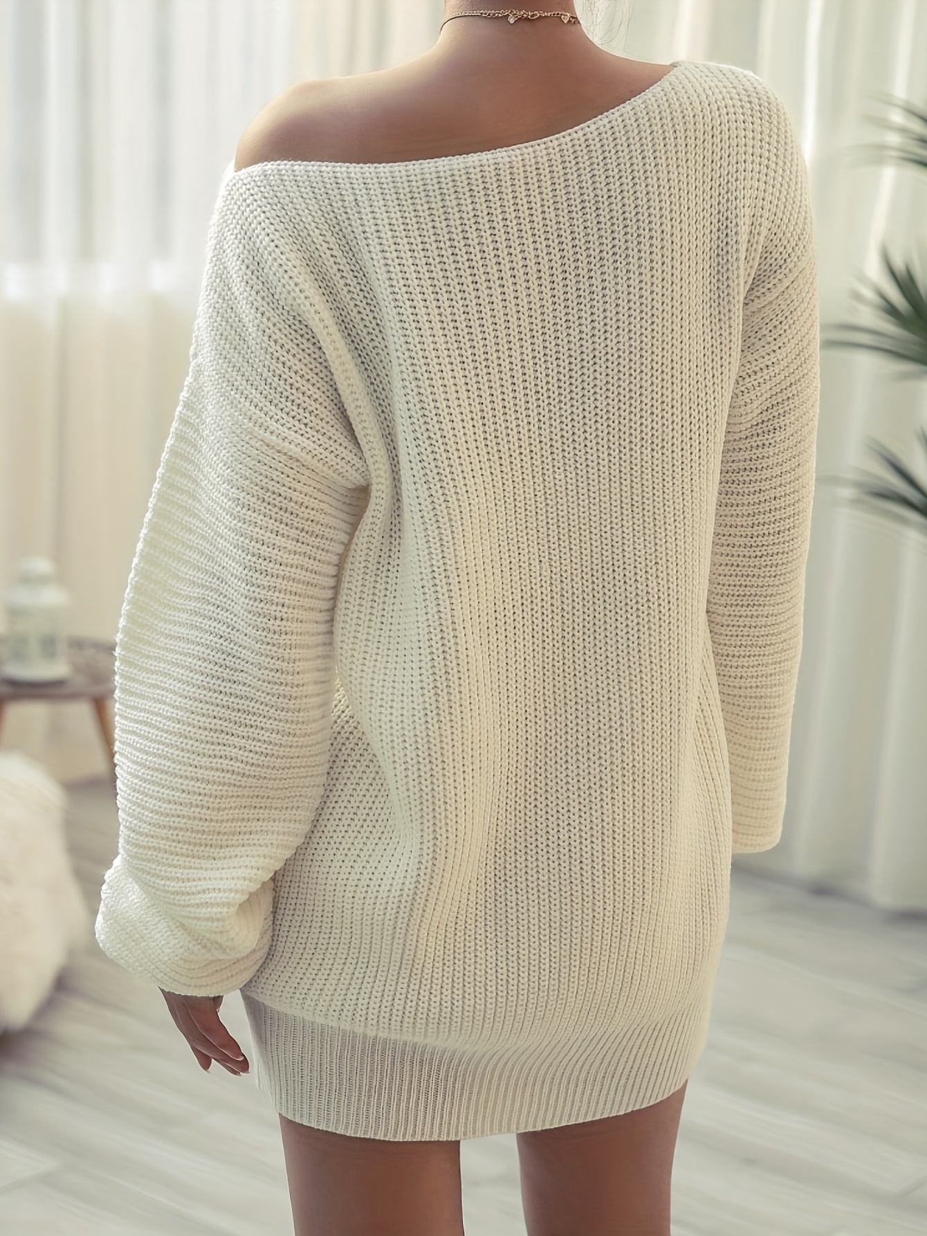 Fleepmart Solid Off Shoulder Knitted Dress Casual Long Sleeve Sweater Dress For Fall & Winter Women’s Clothing