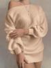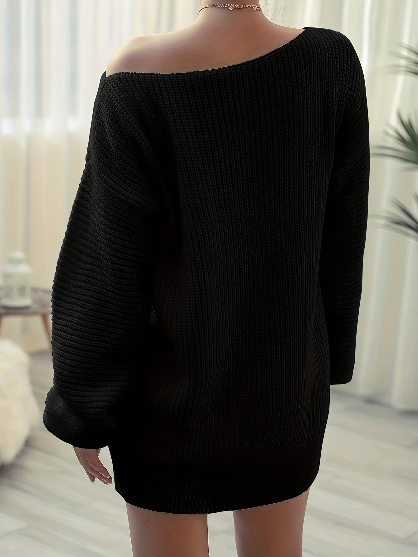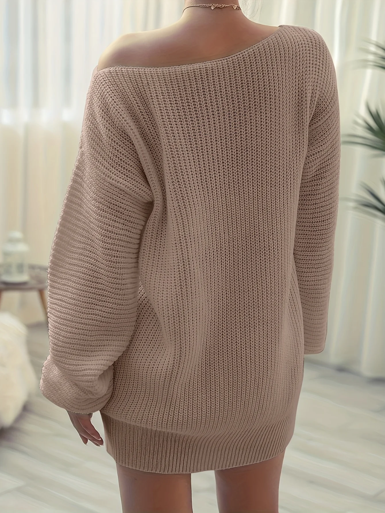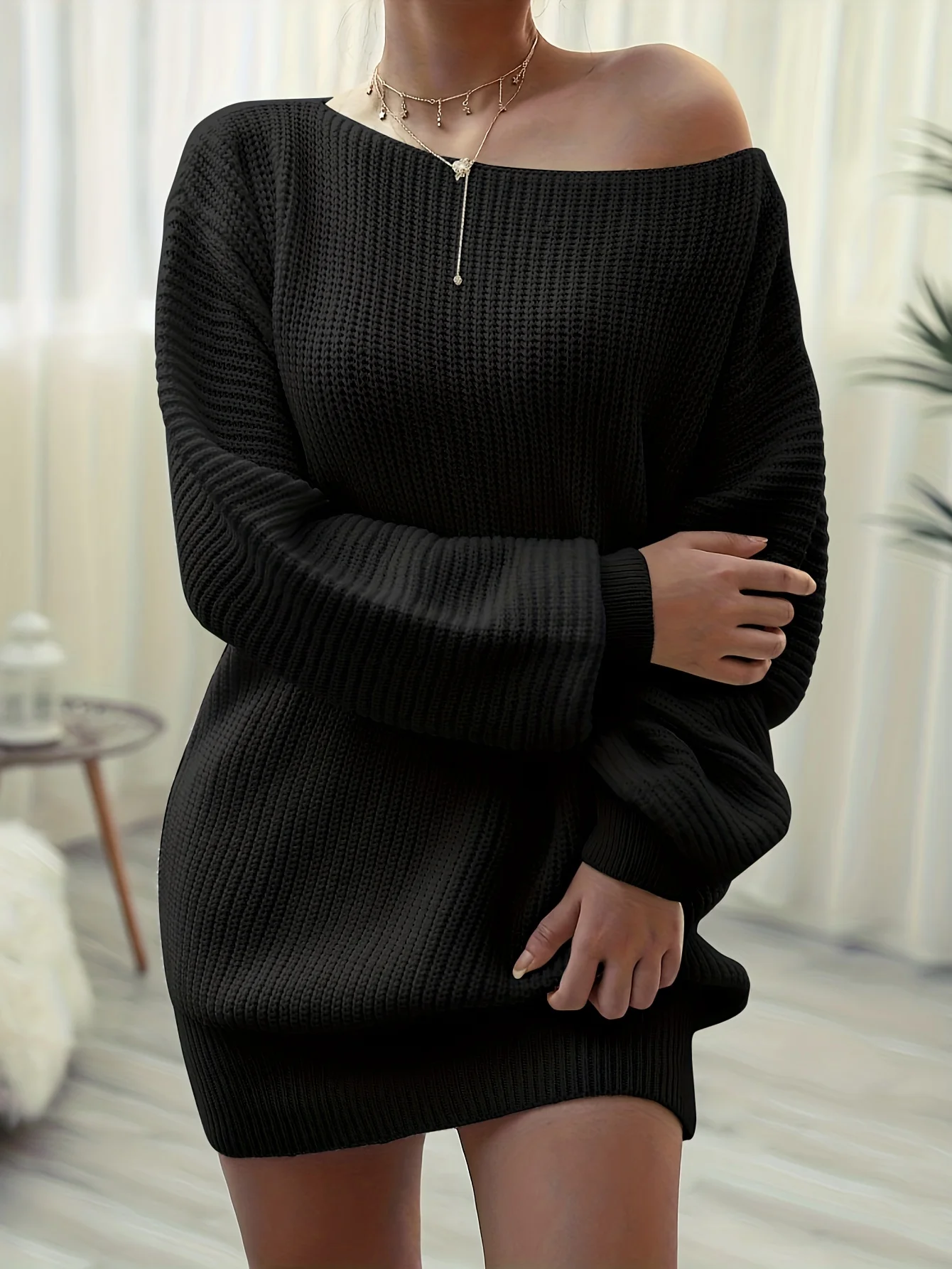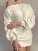 Fleepmart Solid Off Shoulder Knitted Dress Casual Long Sleeve Sweater Dress For Fall & Winter Women’s Clothing
