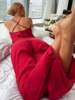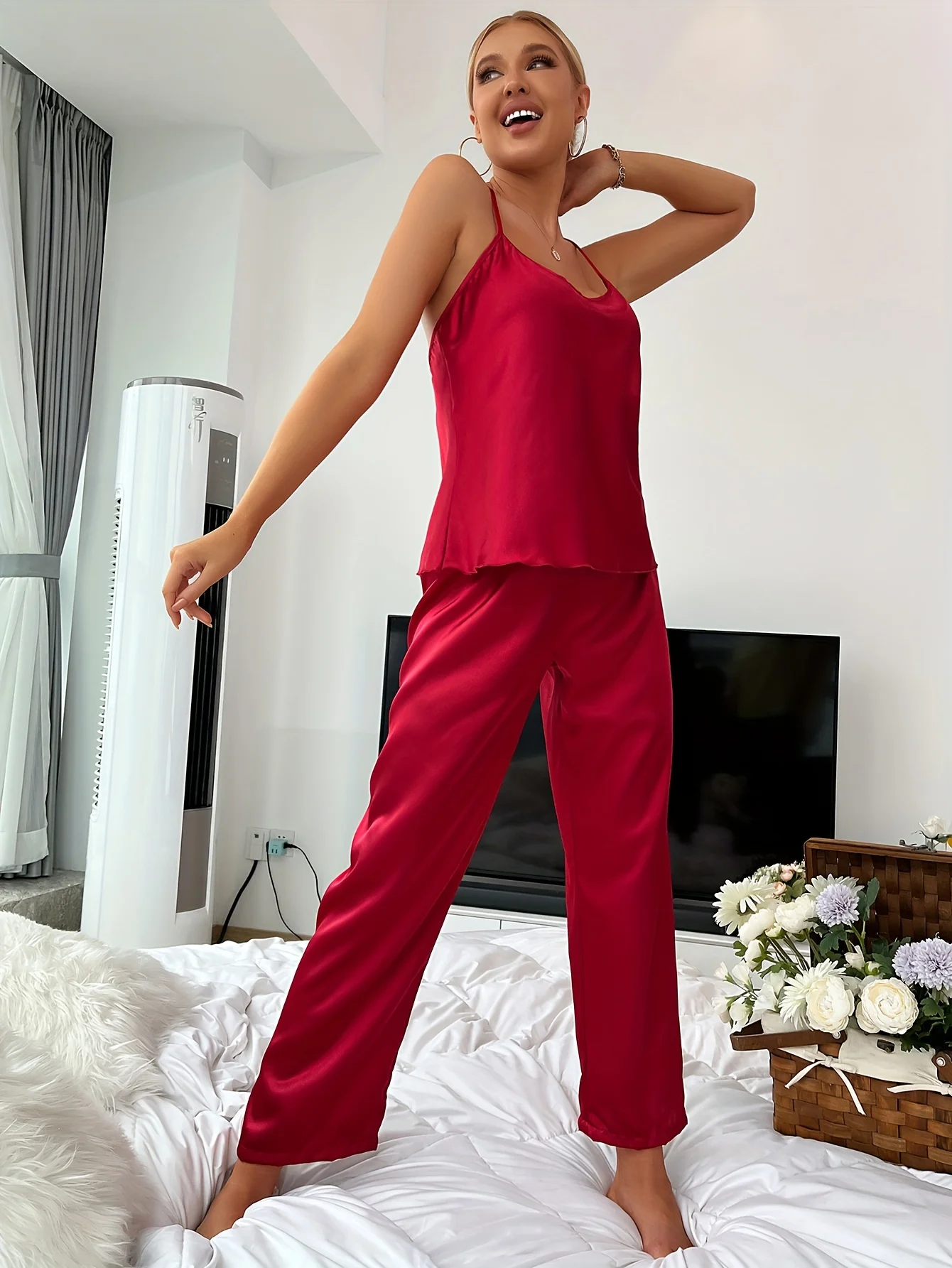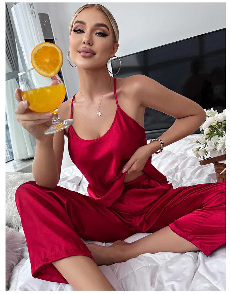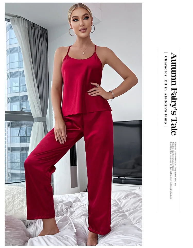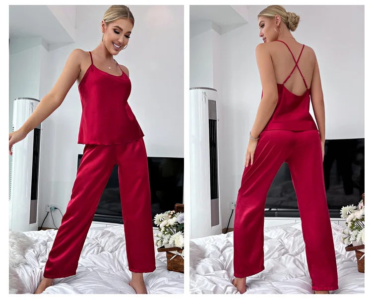 Fleepmart Solid Satin Pajama Set Criss Cross Back Cami Top Elastic Waistband Pants Women’s Sleepwear Loungewear
