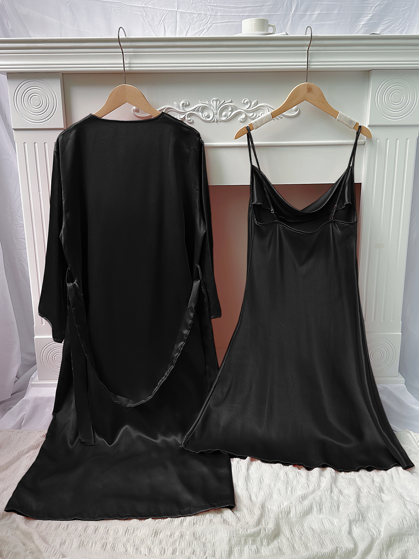 Fleepmart Solid Satin Pajama Set Long Sleeve Robe With Belt V Neck Slip Dress Women’s Sleepwear Loungewear