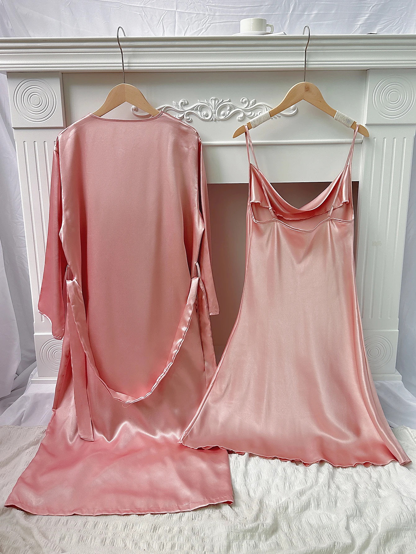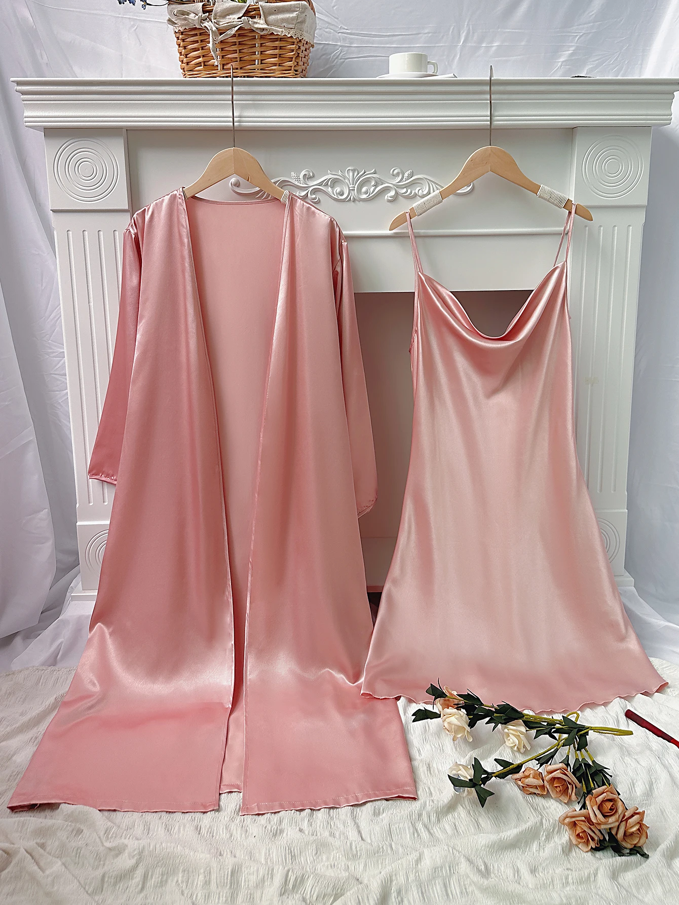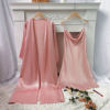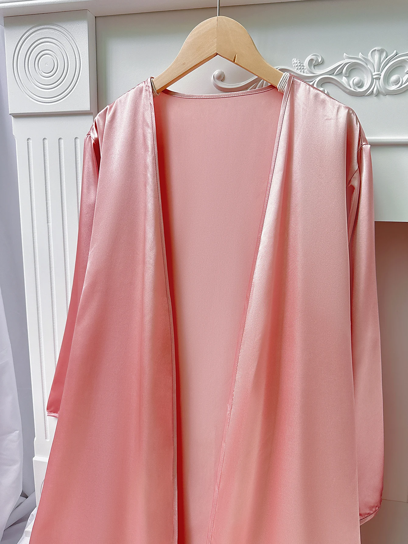 Fleepmart Solid Satin Pajama Set Long Sleeve Robe With Belt V Neck Slip Dress Women’s Sleepwear Loungewear