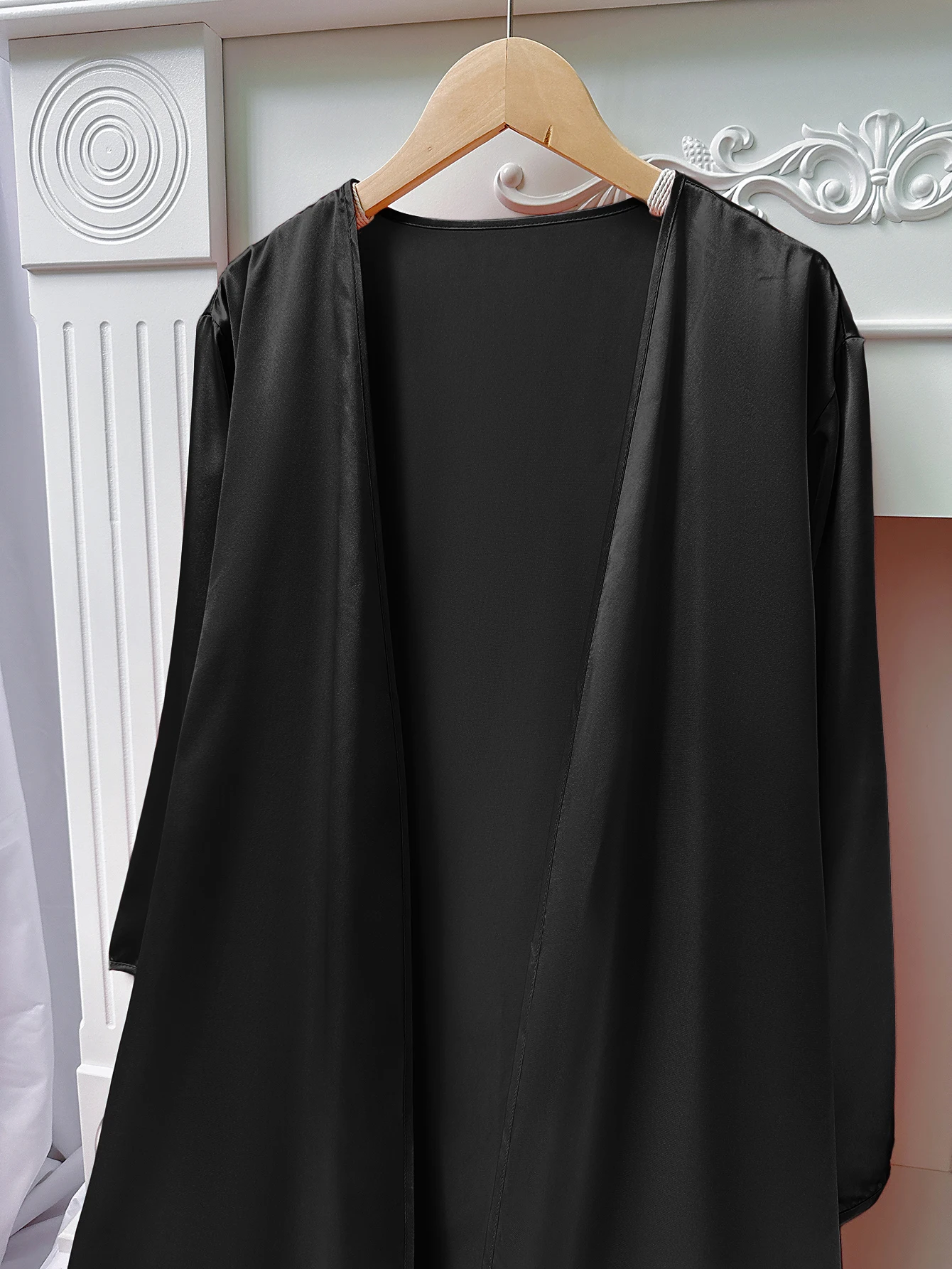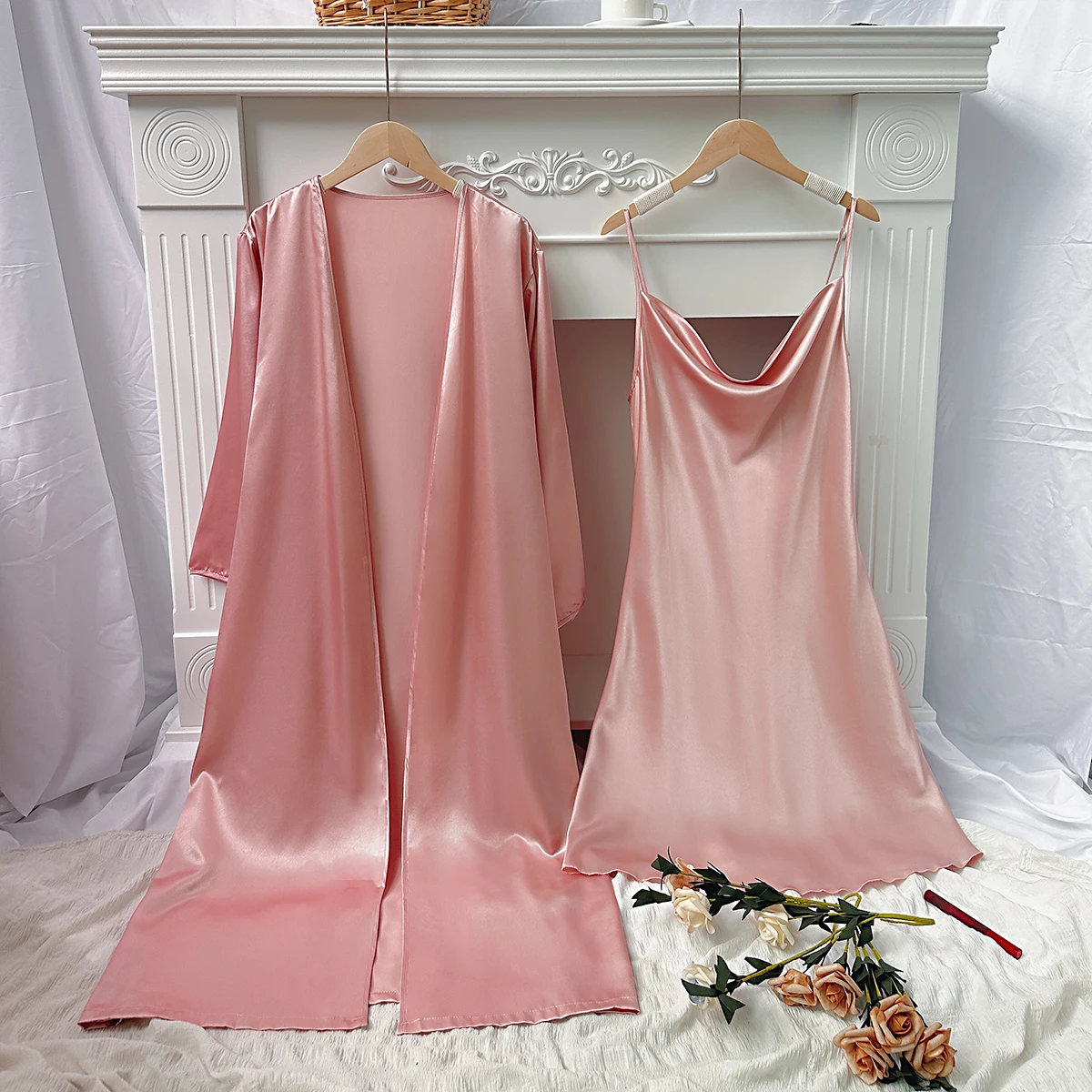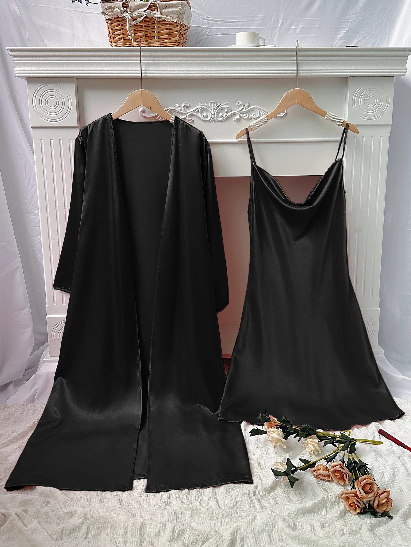 Fleepmart Solid Satin Pajama Set Long Sleeve Robe With Belt V Neck Slip Dress Women’s Sleepwear Loungewear
