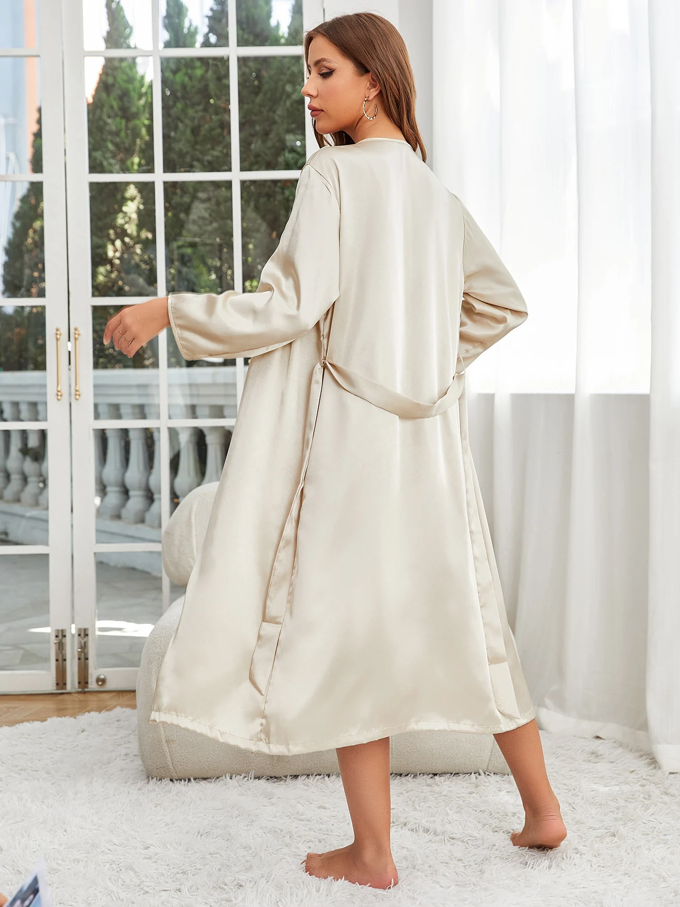 Fleepmart Solid Satin Pajamas Sets Sexy Belted Night Robes V Neck Nightdress Comfortable Breathable Sleepwear for Women