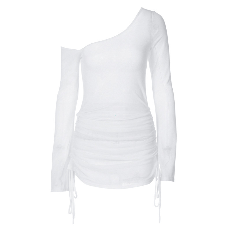 Fleepmart Solid Skew Collar Ruched Straps Lace-Up See Through Draw String Mini Dress 2025 Summer Women Party Clubwear