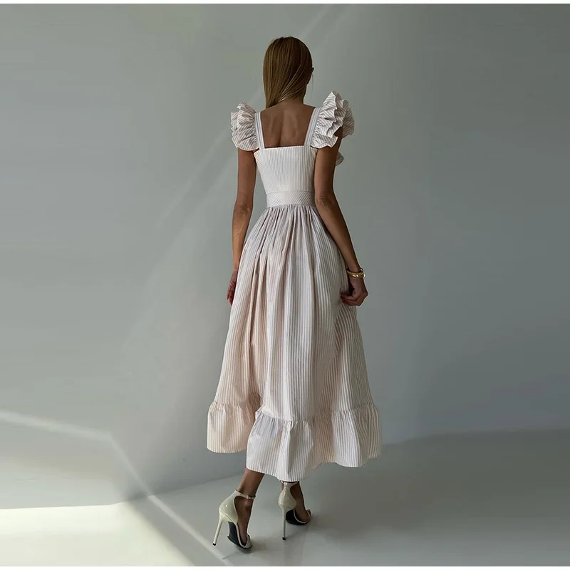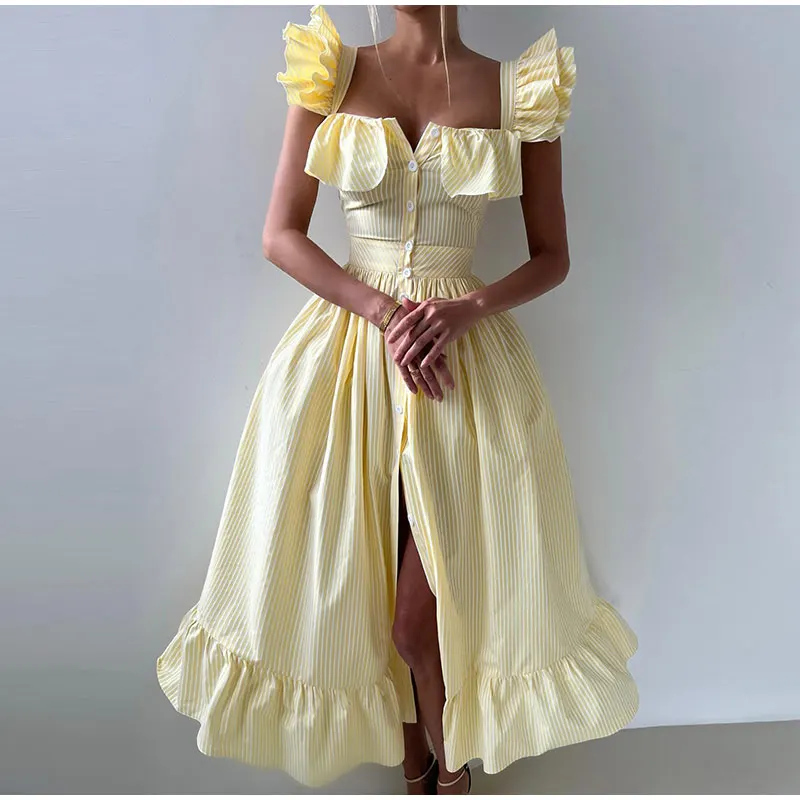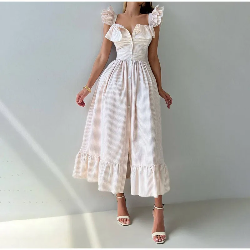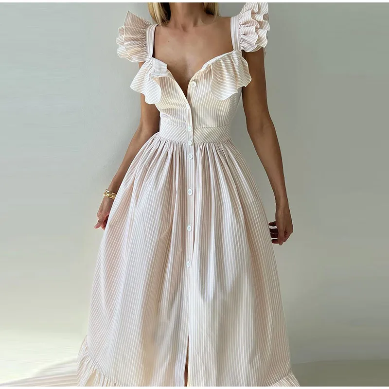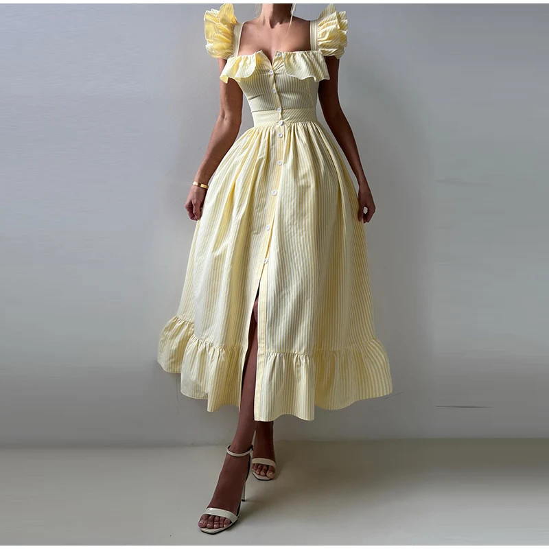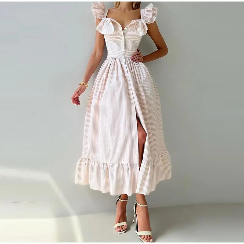 Fleepmart Solid Striped Fly Sleeve Women ‘s Dress Solid V-neck Single Breasted Draped Front Split Dressess Female Summer Lady Party Robes