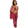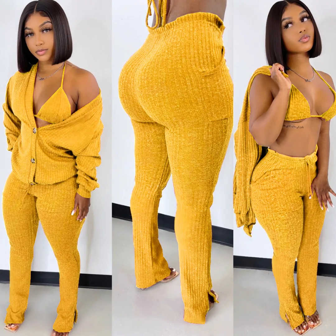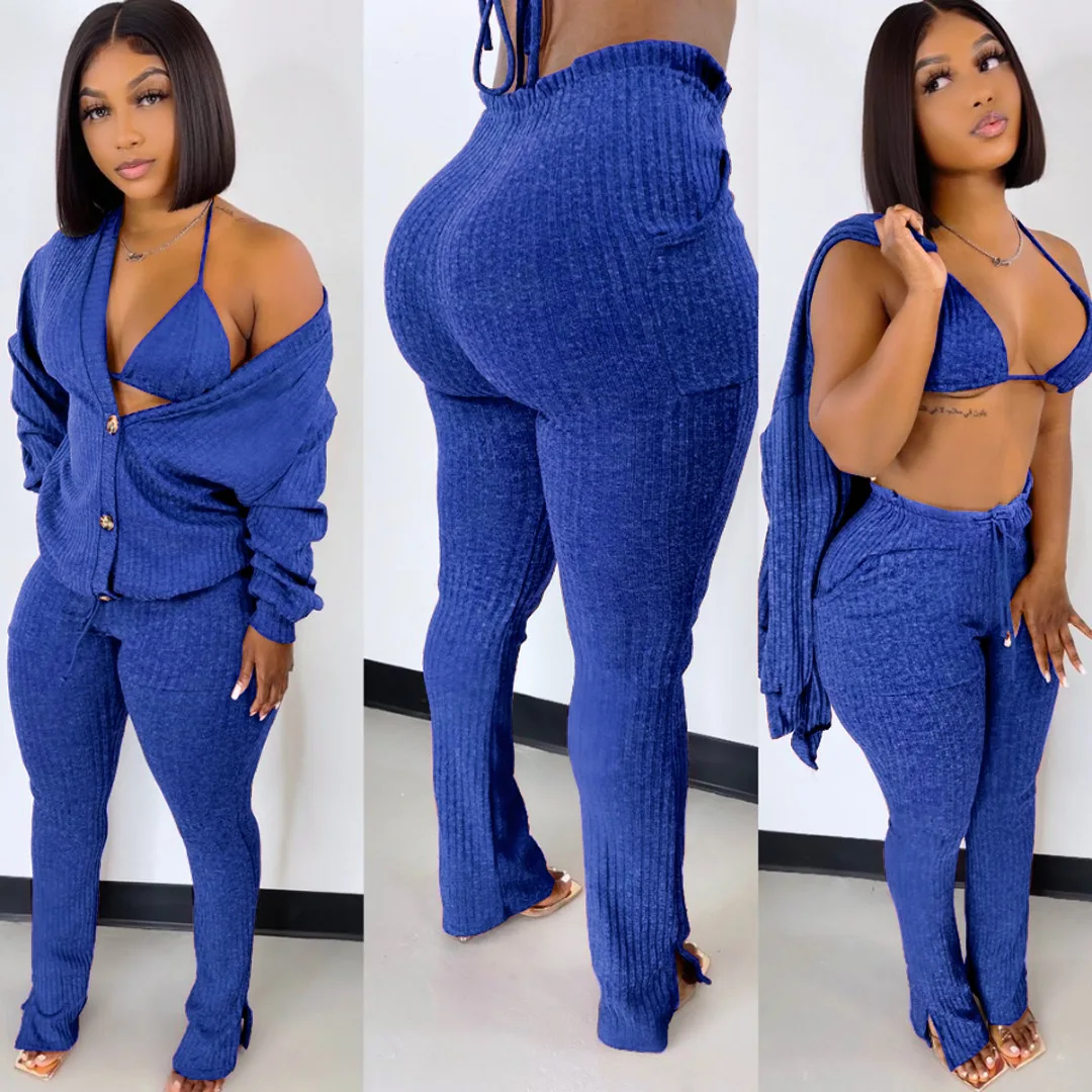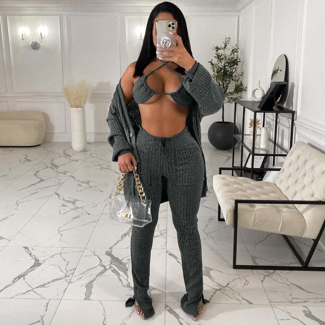 Fleepmart Solid Wool Knitted Rib 3 Piece Set Fall Winter Clothes for Women Casual Button Coat + Slit Flare Pants Tracksuit Women Sweatsuit