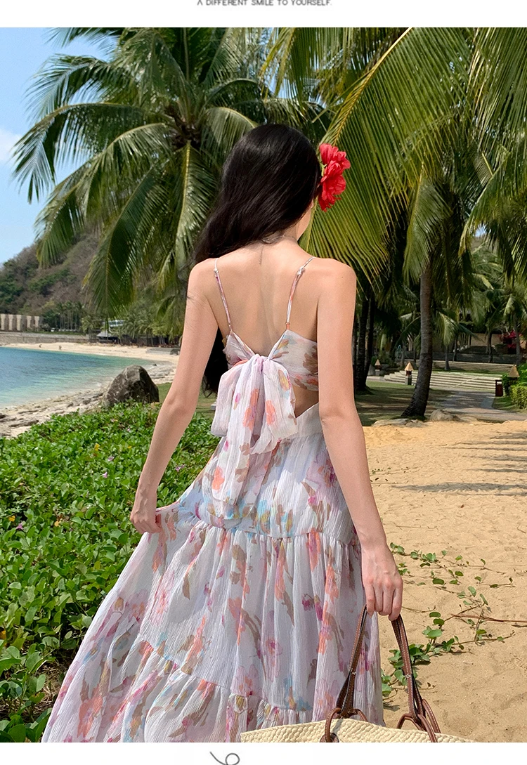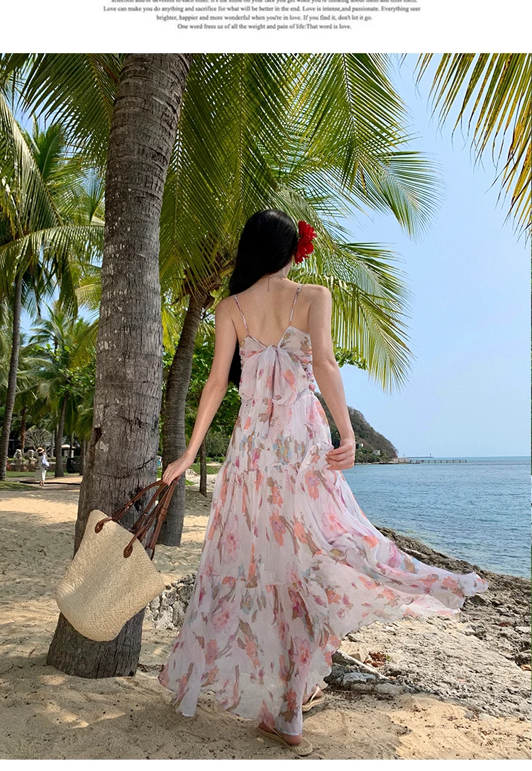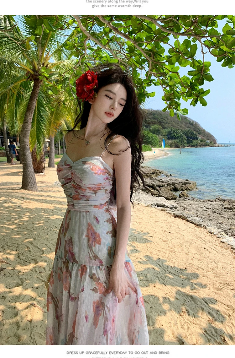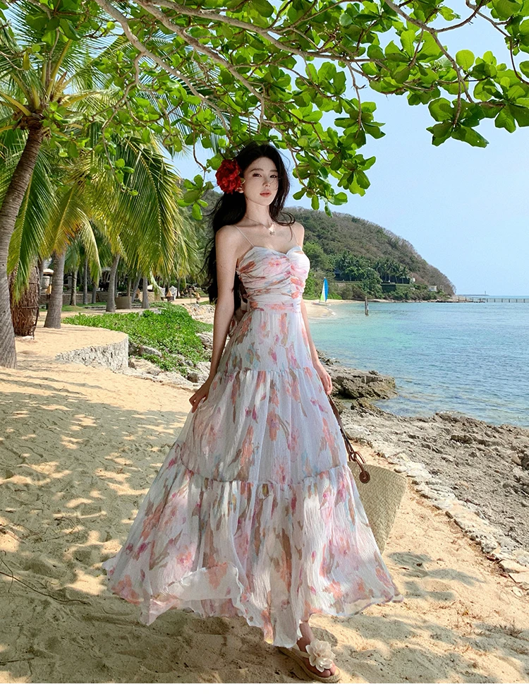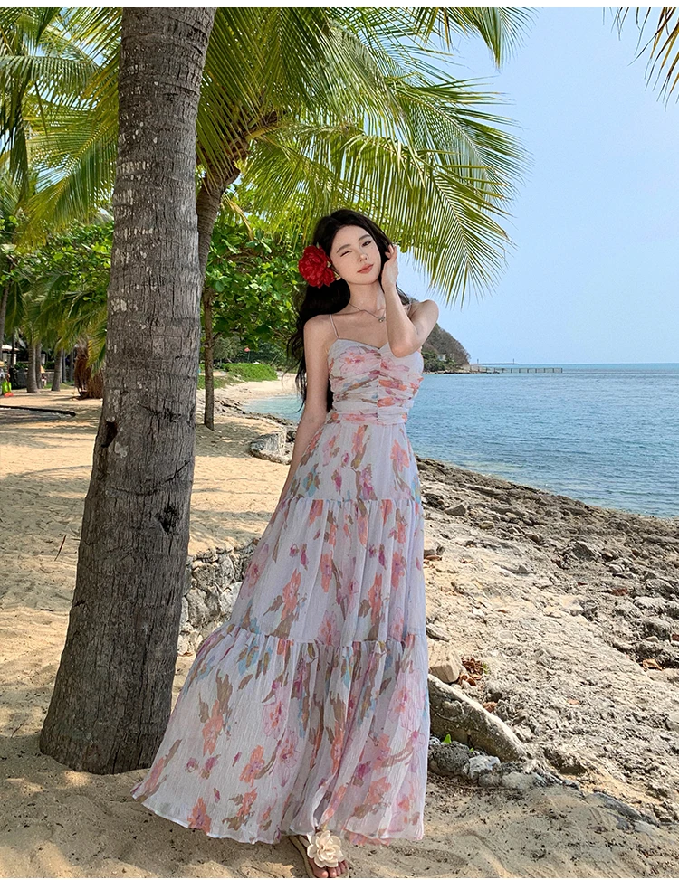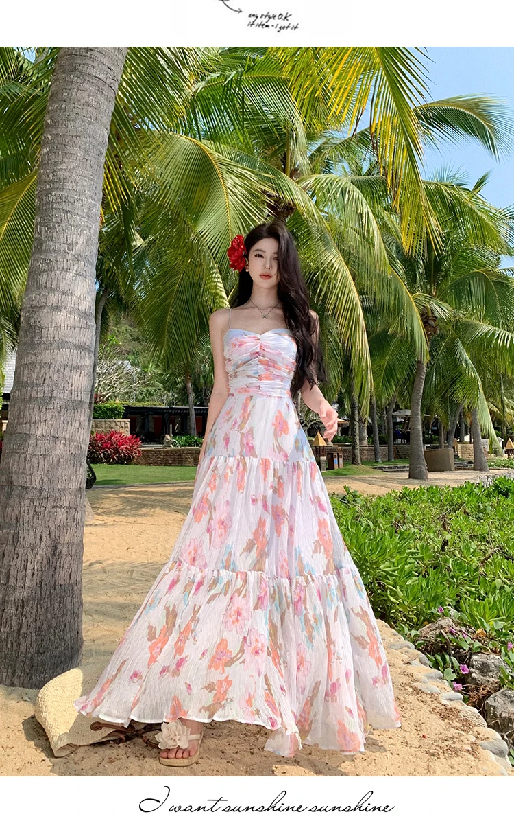 Fleepmart Spaghetti Strap Elegant Women Summer Dress Sleeveless Casual Floral Print A-Line Beach Holiday Clothes Female Long Robe Mujers