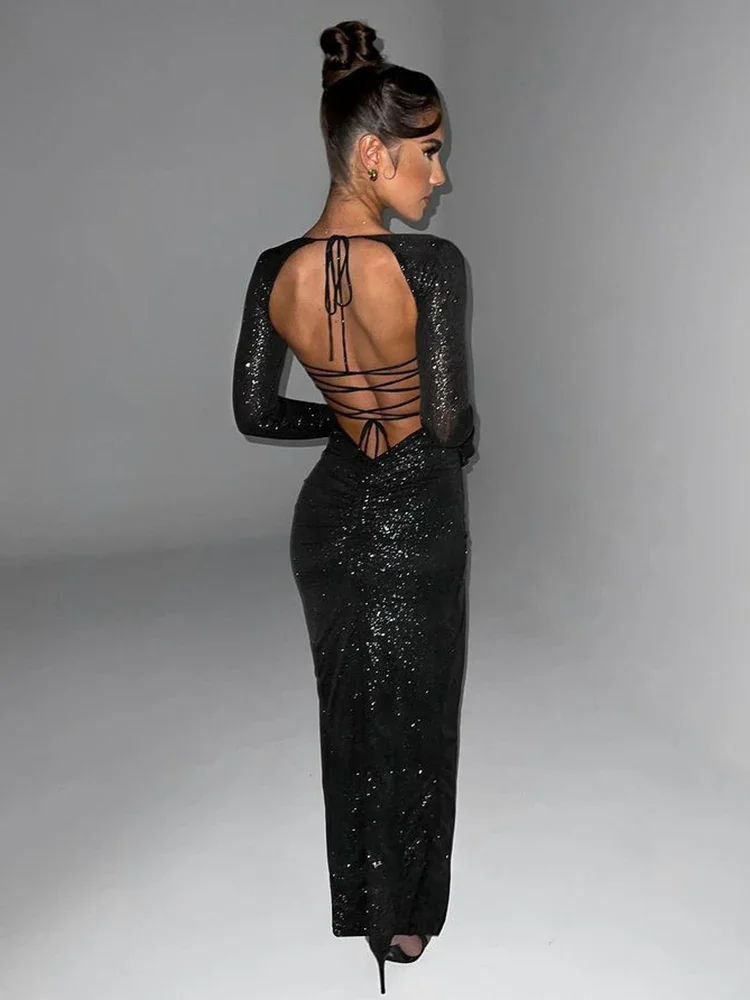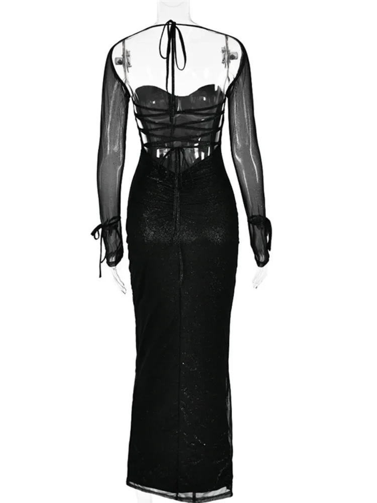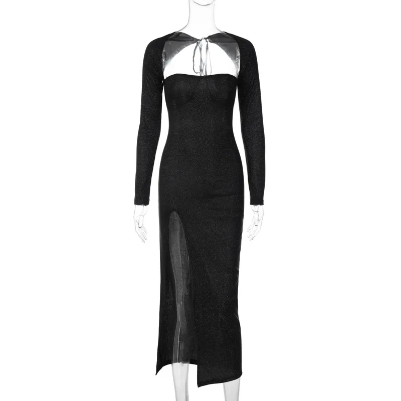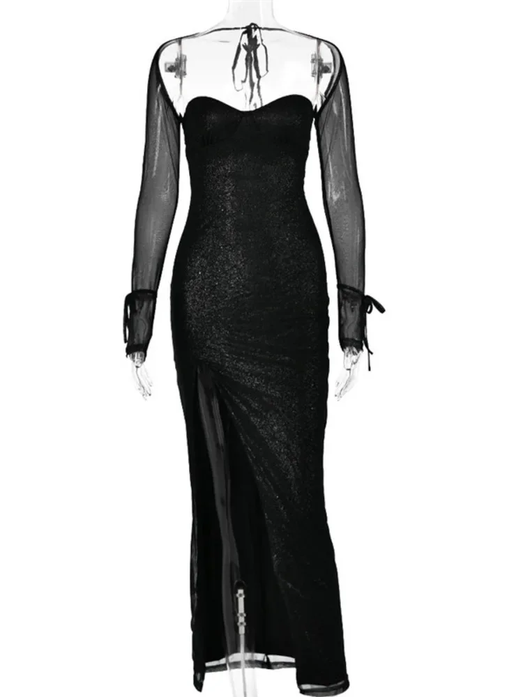 Fleepmart Sparkle Mesh High Split Sexy Maxi Dress for Women Autumn Winter New Sheer Long Sleeve Backless Night Club Party Dress