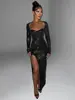 Fleepmart Sparkle Mesh High Split Sexy Maxi Dress for Women Autumn Winter New Sheer Long Sleeve Backless Night Club Party Dress