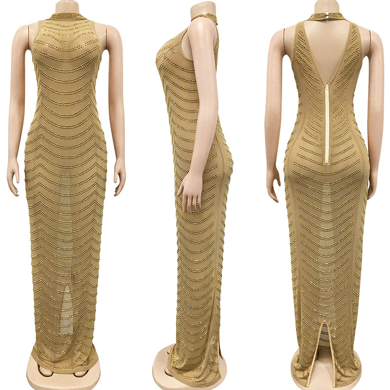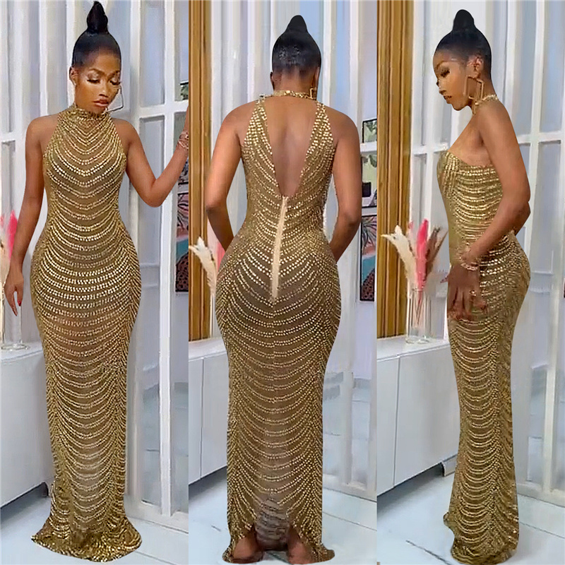 Fleepmart Sparkly Crystal Rhinestone Bodycon Maxi Dress Women Wedding Evening Backless Mesh See Through Night Party Club Birthday Dress