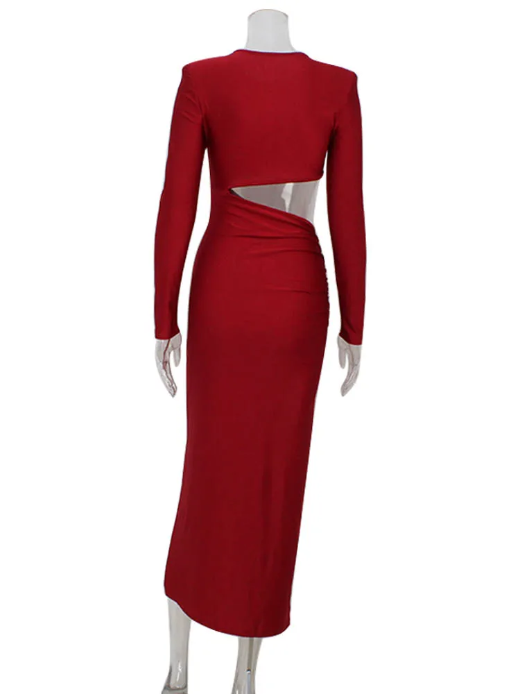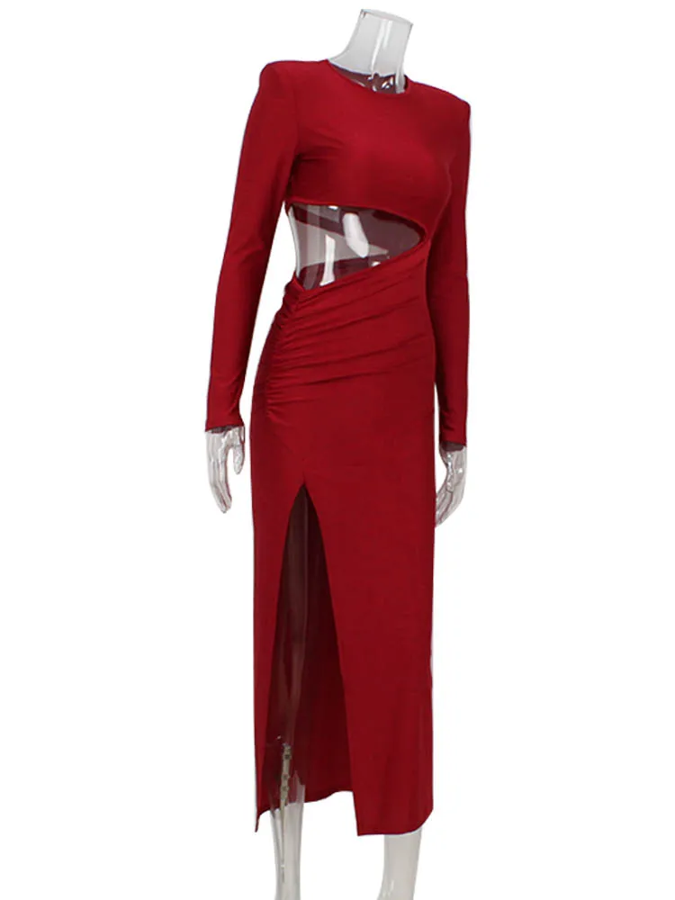 Fleepmart Split Cut Out Solid Elegant Bodycon Women O Neck Long Sleeve Sheath Outfits Sexy Club Fashion Dress