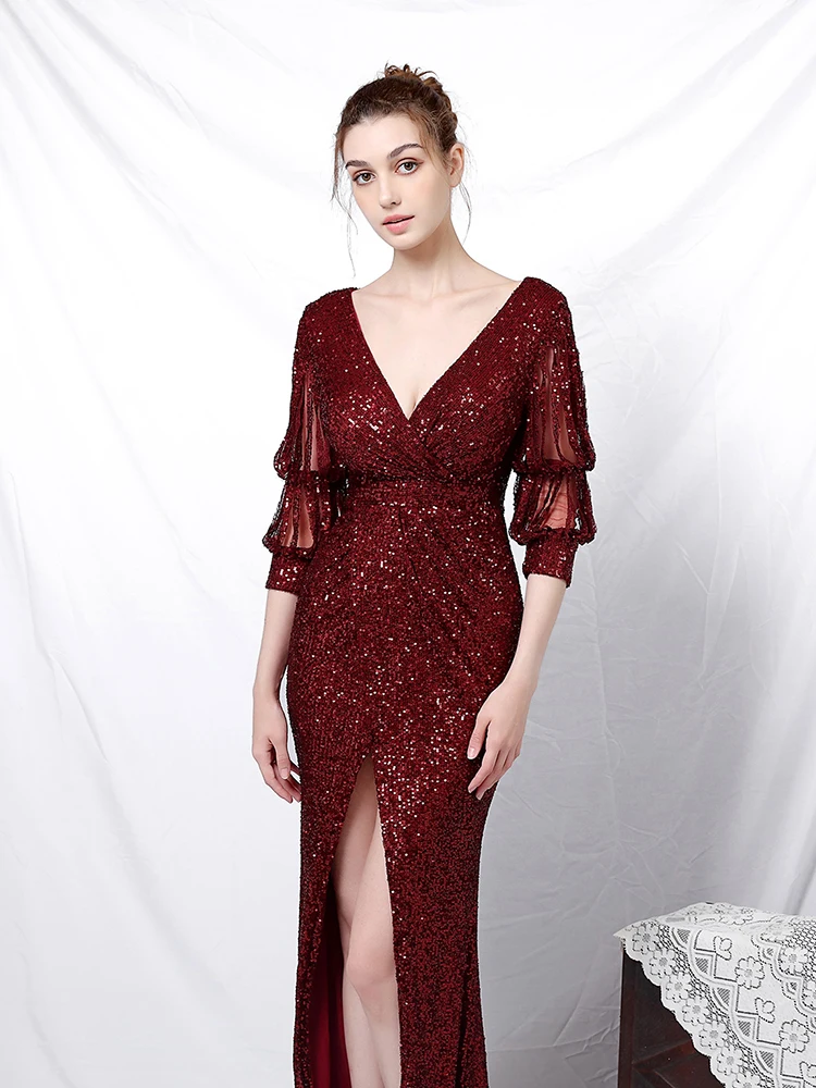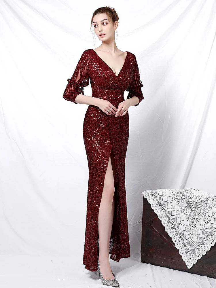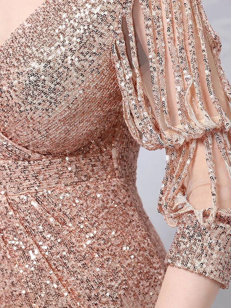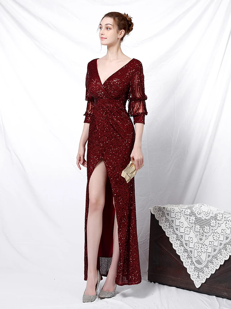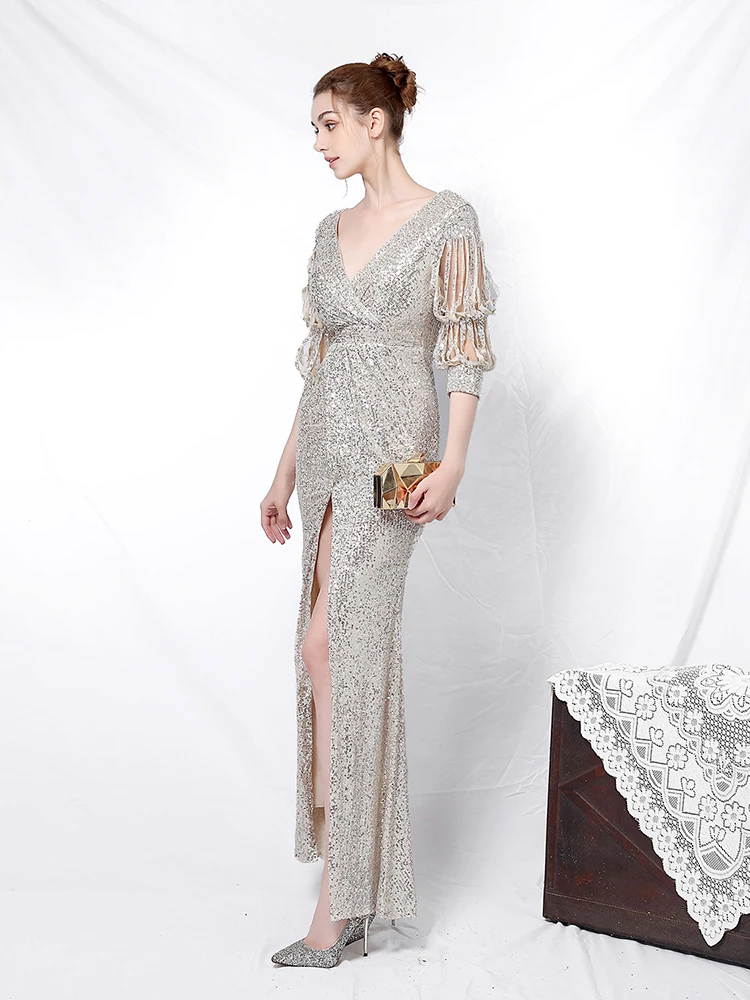 Fleepmart Split V neck Long sleeve Cocktail Party Dress Women’s Sexy Sequins Robe Floor length Shinning Formal Vestidoes Simple Full Dress