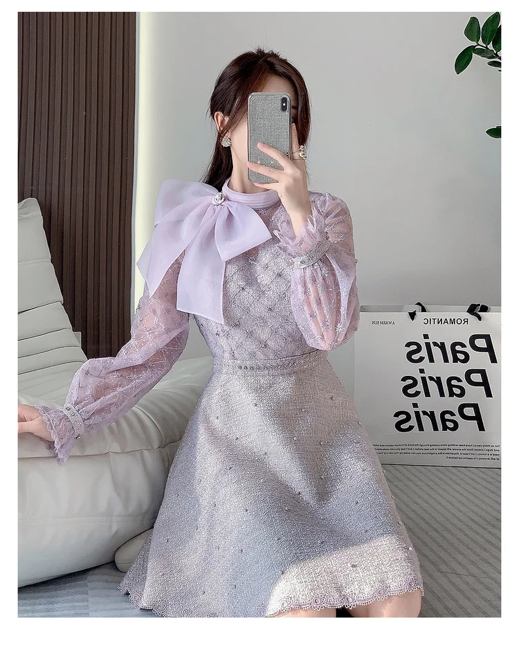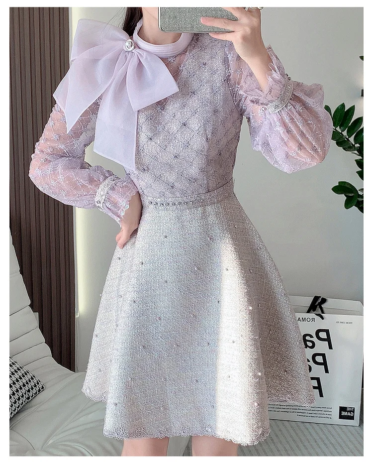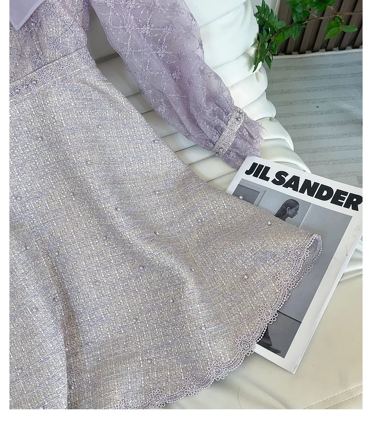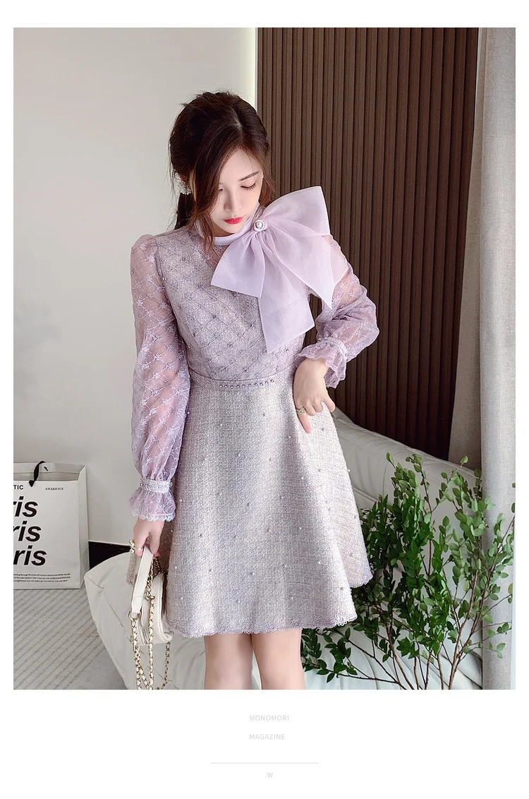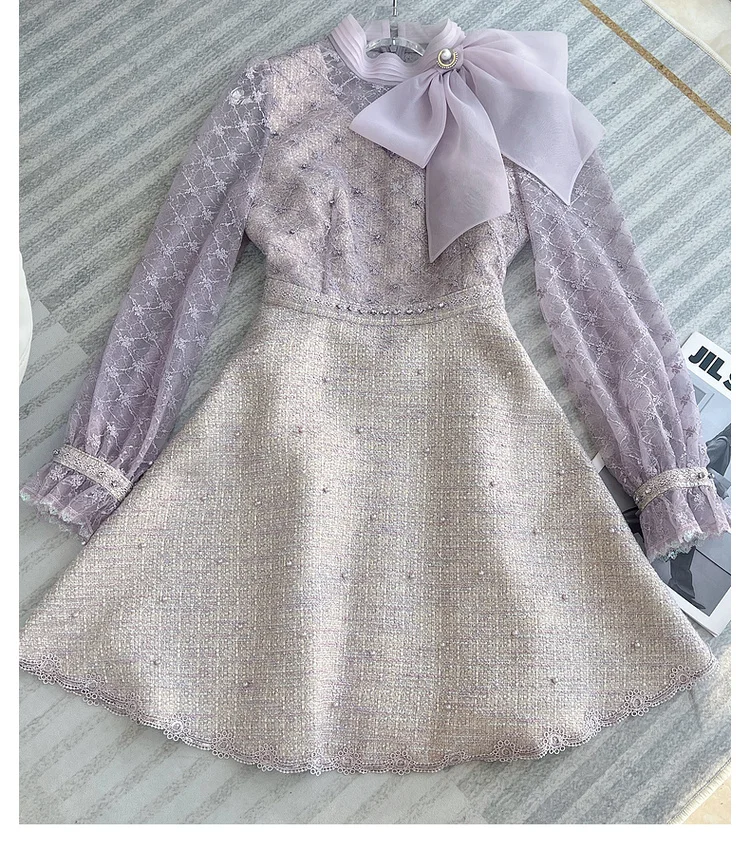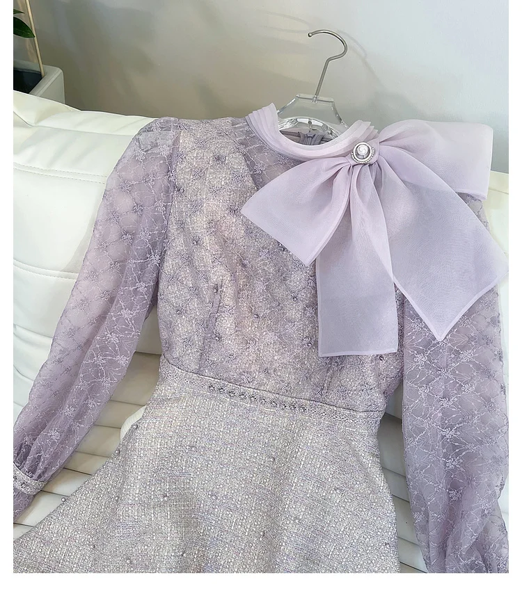 Fleepmart Spring Autumn Elegant Purple Bubble Long Sleeve Stand Collar Lace Stitching Tweed Dress Sweet Bowknot Beading Embroidery Dress