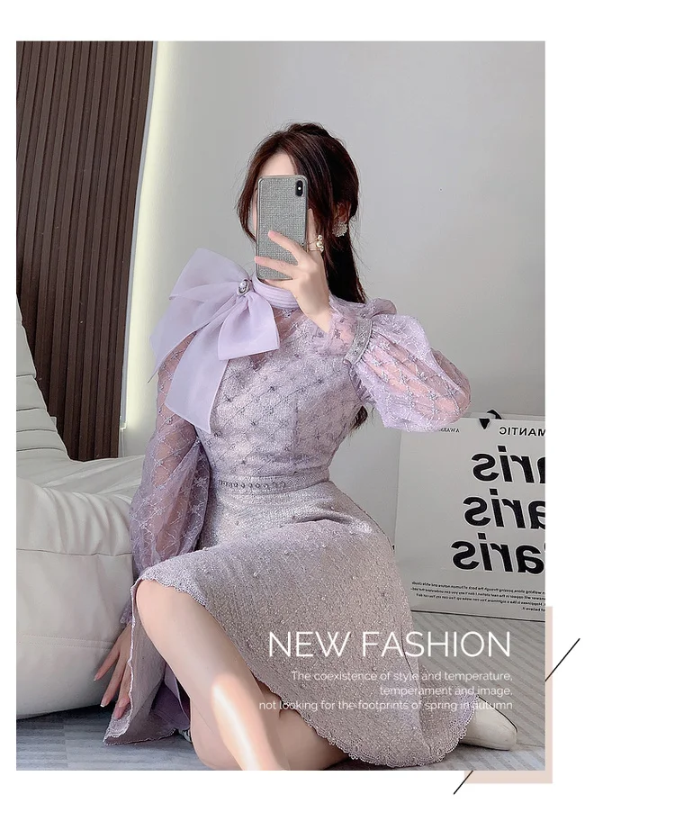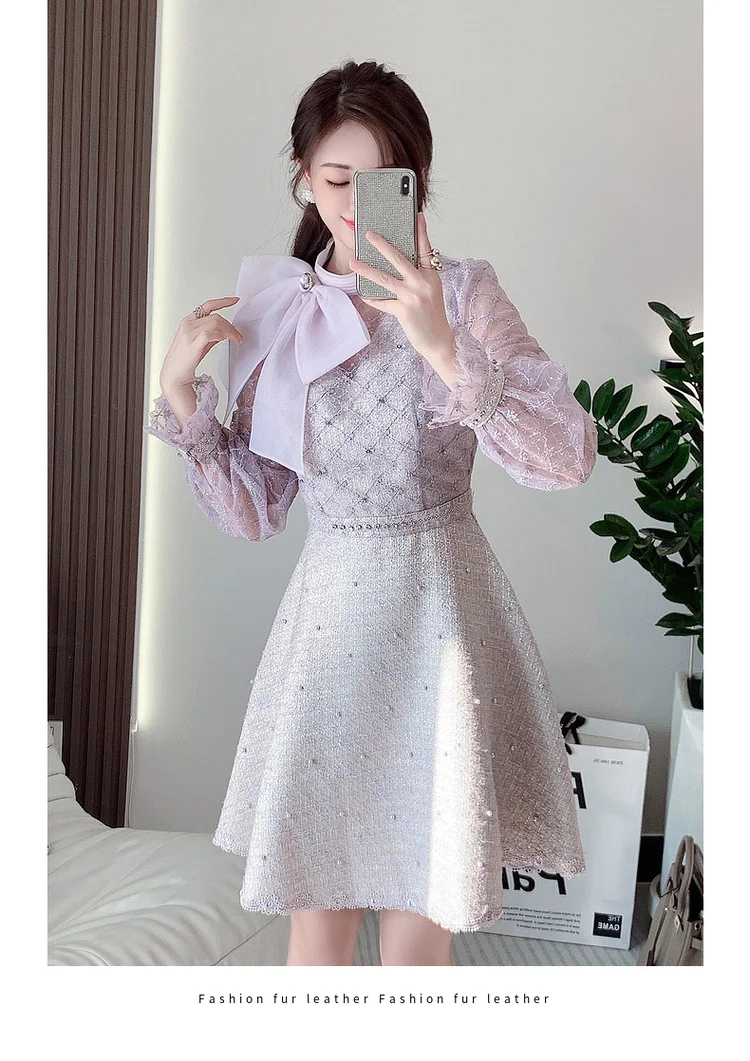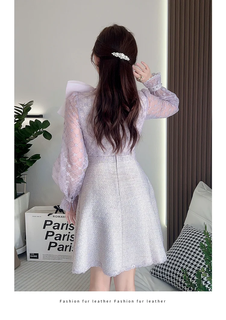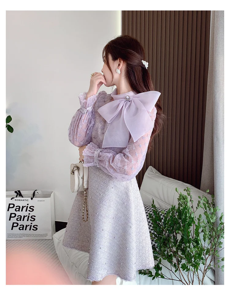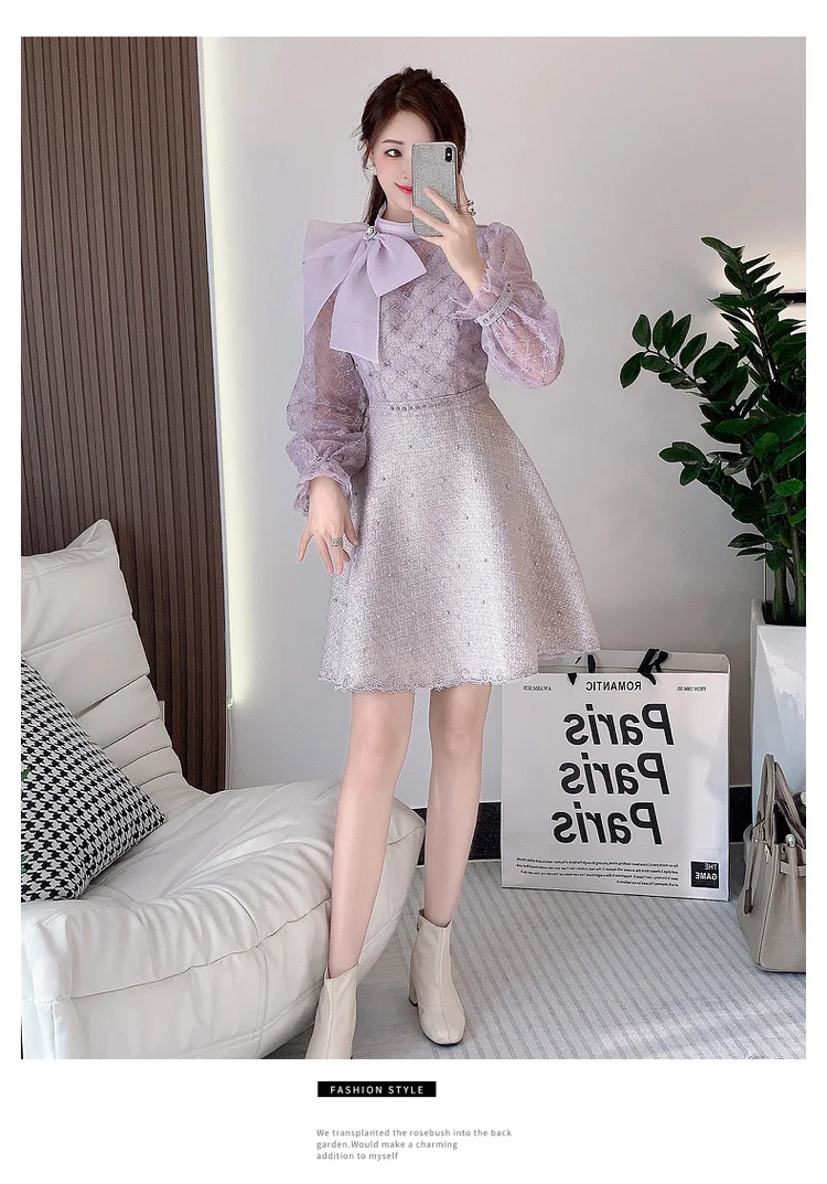 Fleepmart Spring Autumn Elegant Purple Bubble Long Sleeve Stand Collar Lace Stitching Tweed Dress Sweet Bowknot Beading Embroidery Dress