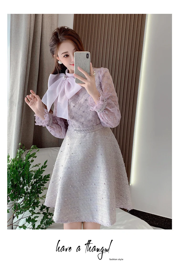 Fleepmart Spring Autumn Elegant Purple Bubble Long Sleeve Stand Collar Lace Stitching Tweed Dress Sweet Bowknot Beading Embroidery DressFleepmart Spring Autumn Elegant Purple Bubble Long Sleeve Stand Collar Lace Stitching Tweed Dress Sweet Bowknot Beading Embroidery Dress