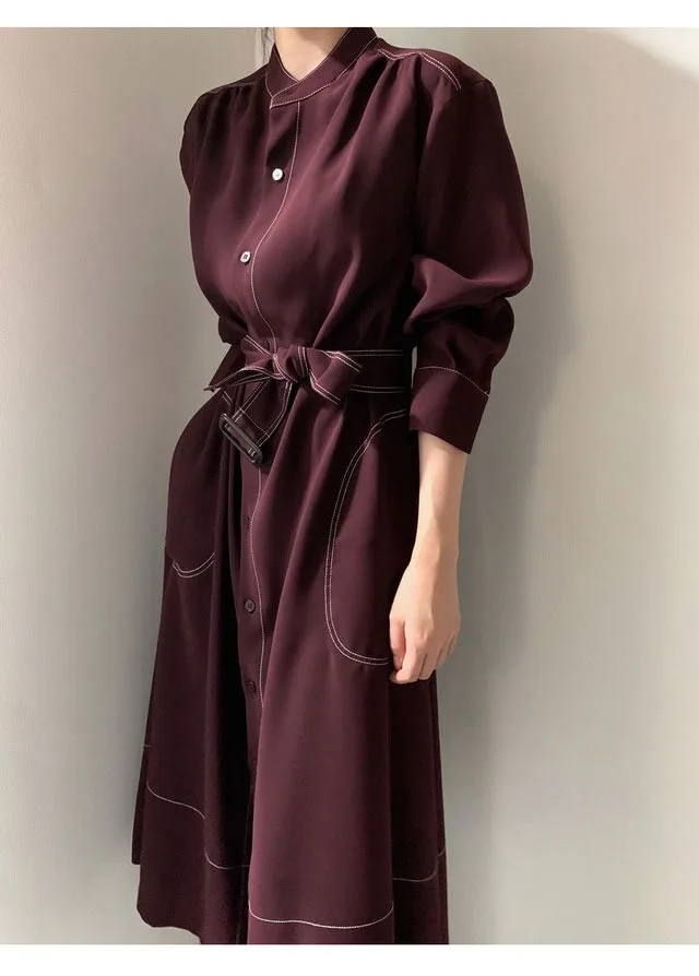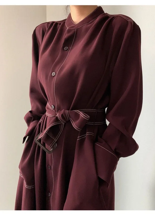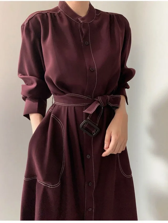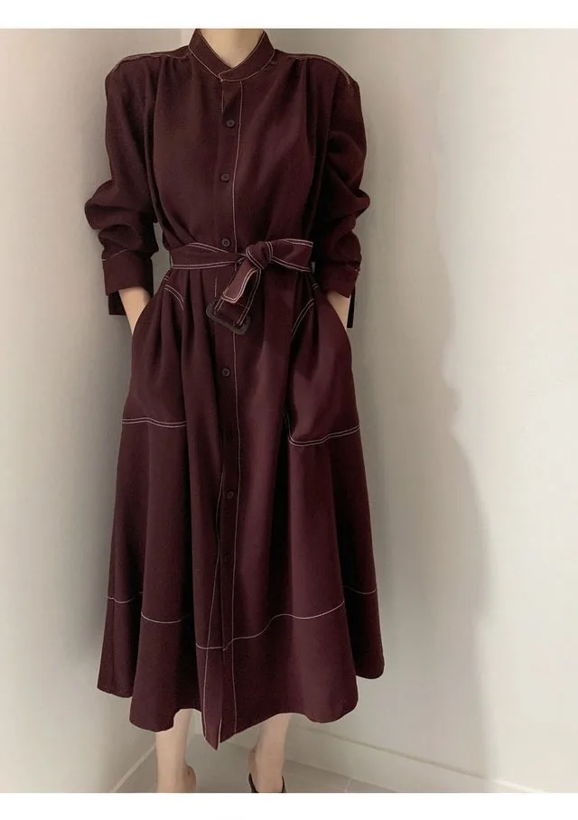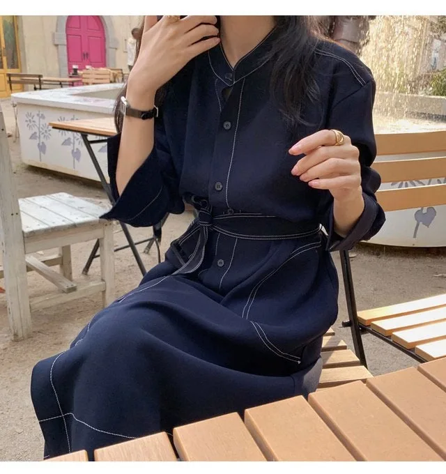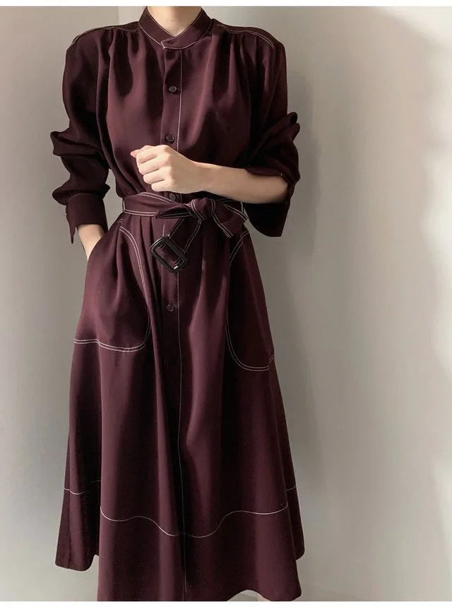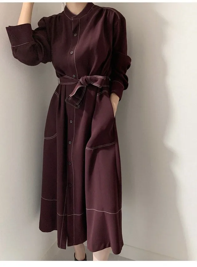 Fleepmart Spring Autumn Single Breasted Women’s Shirt Dresses Sashes 2025 New Stand Collar Korean Casual Straight Dress Female