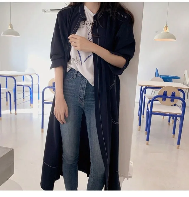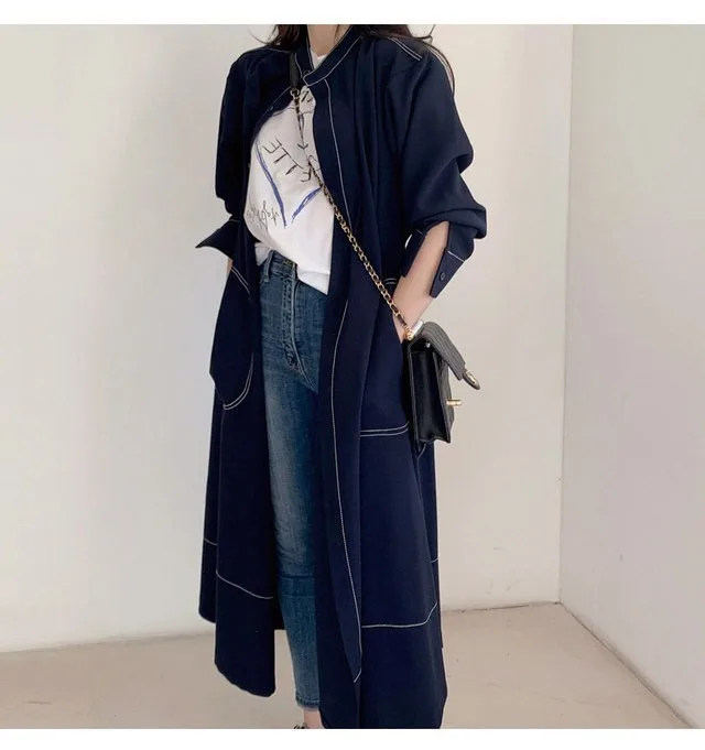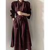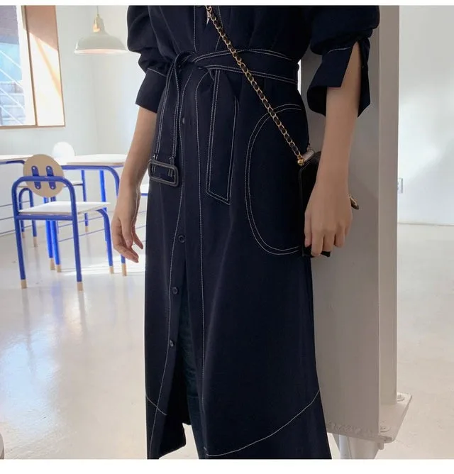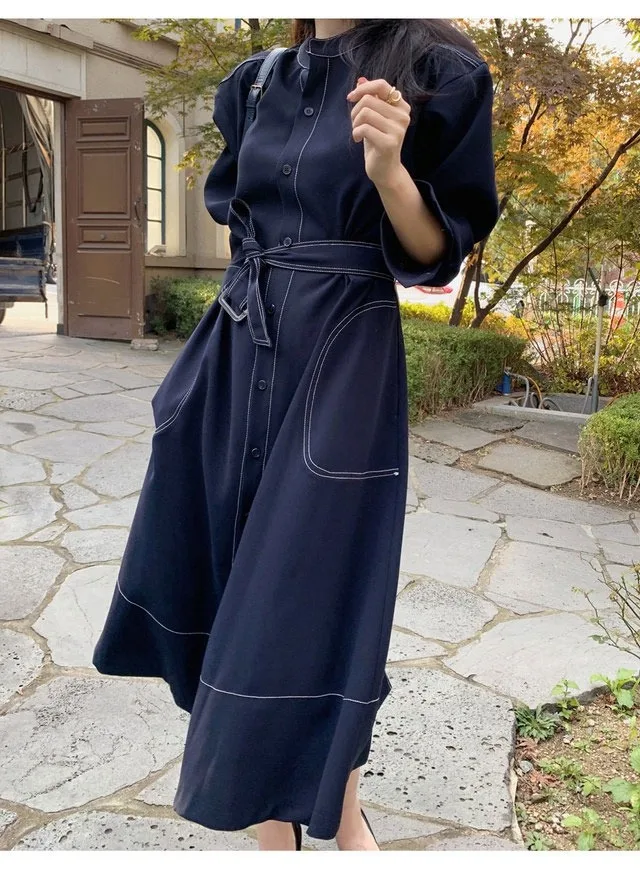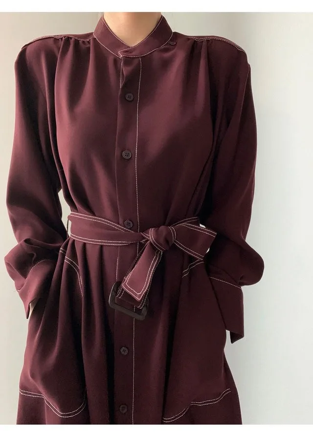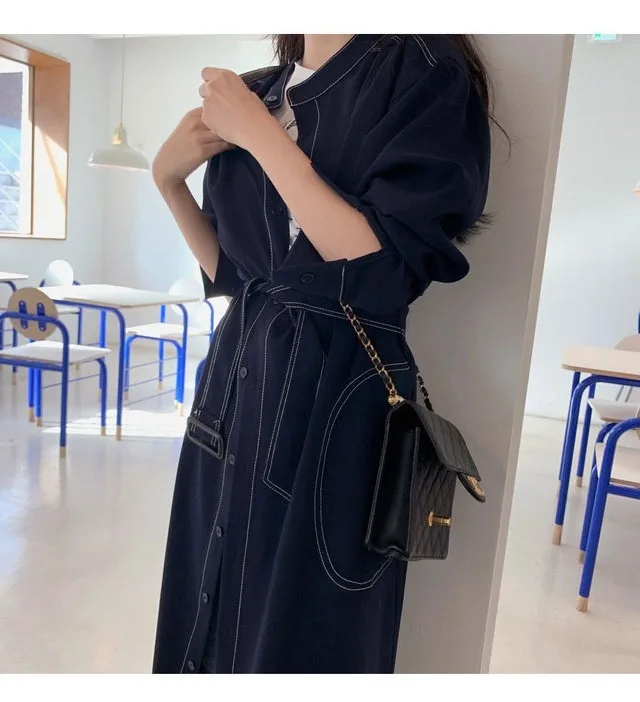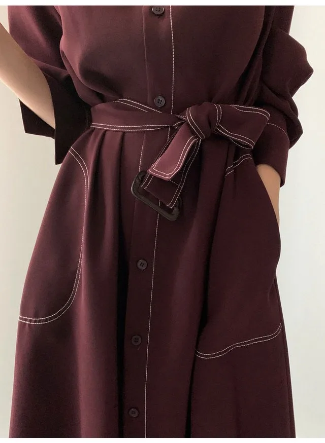 Fleepmart Spring Autumn Single Breasted Women’s Shirt Dresses Sashes 2025 New Stand Collar Korean Casual Straight Dress Female