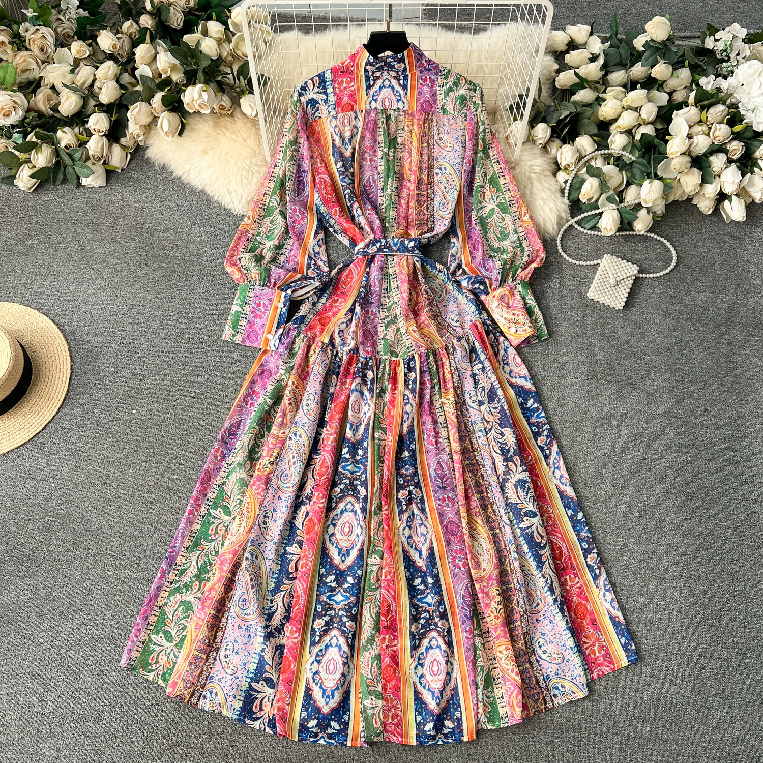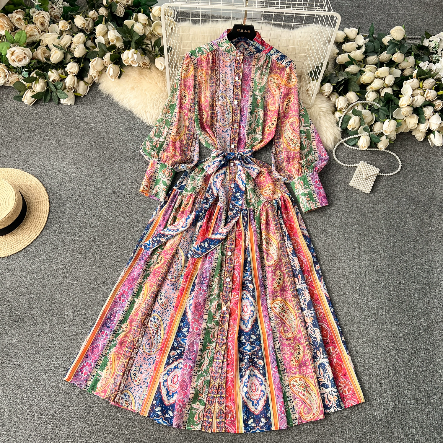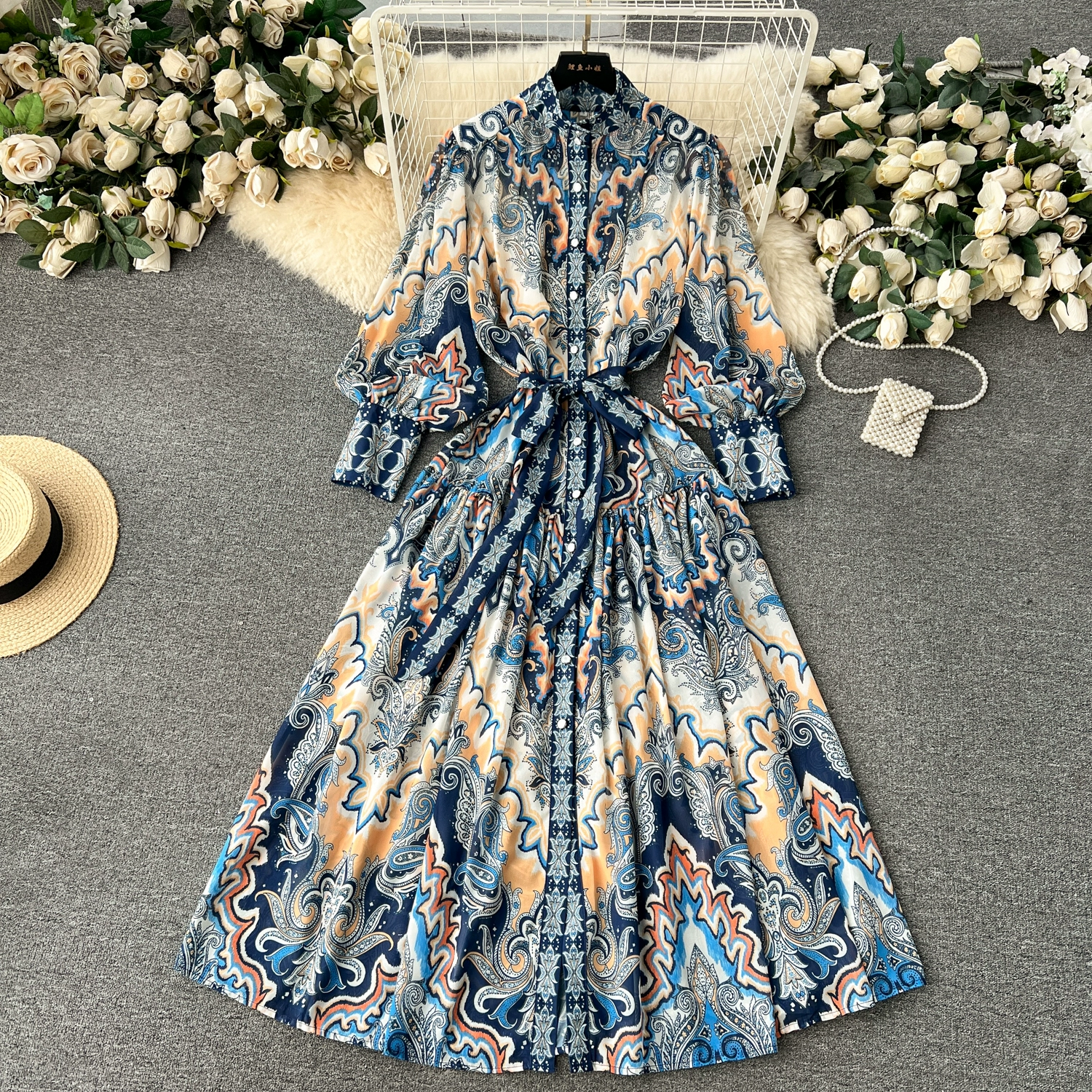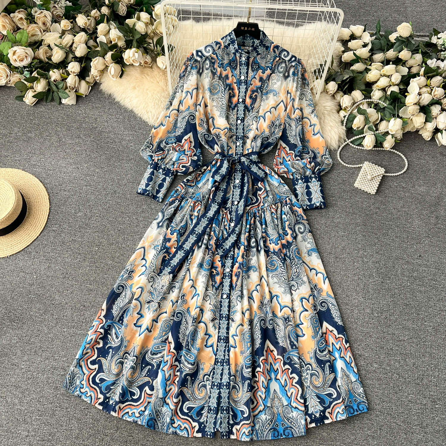 Fleepmart Spring Holiday Paisley Maxi Dress Women Clothing Turleneck Long Lantern Sleeve Flower Retro Print Belted Chiffon Loose Vestidos