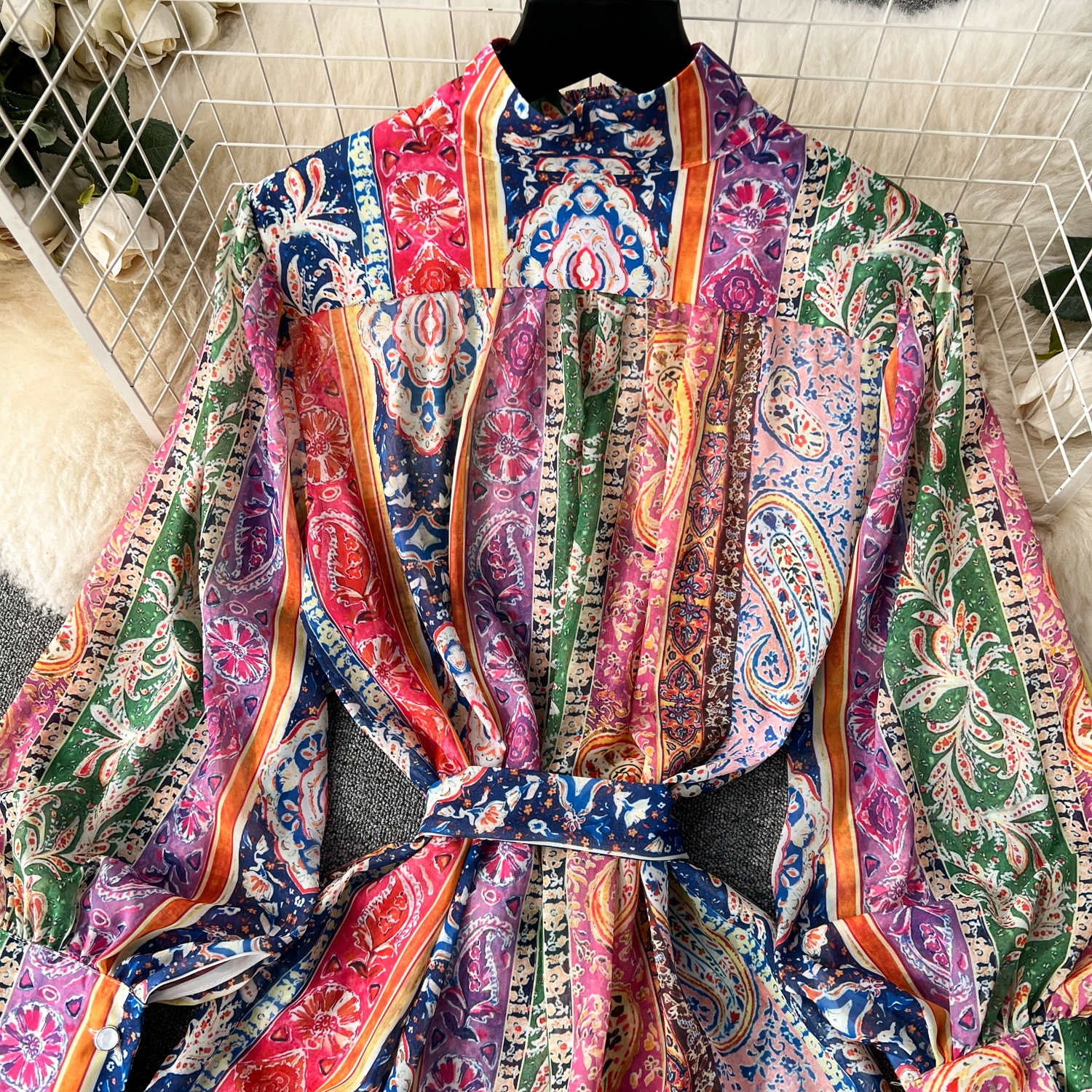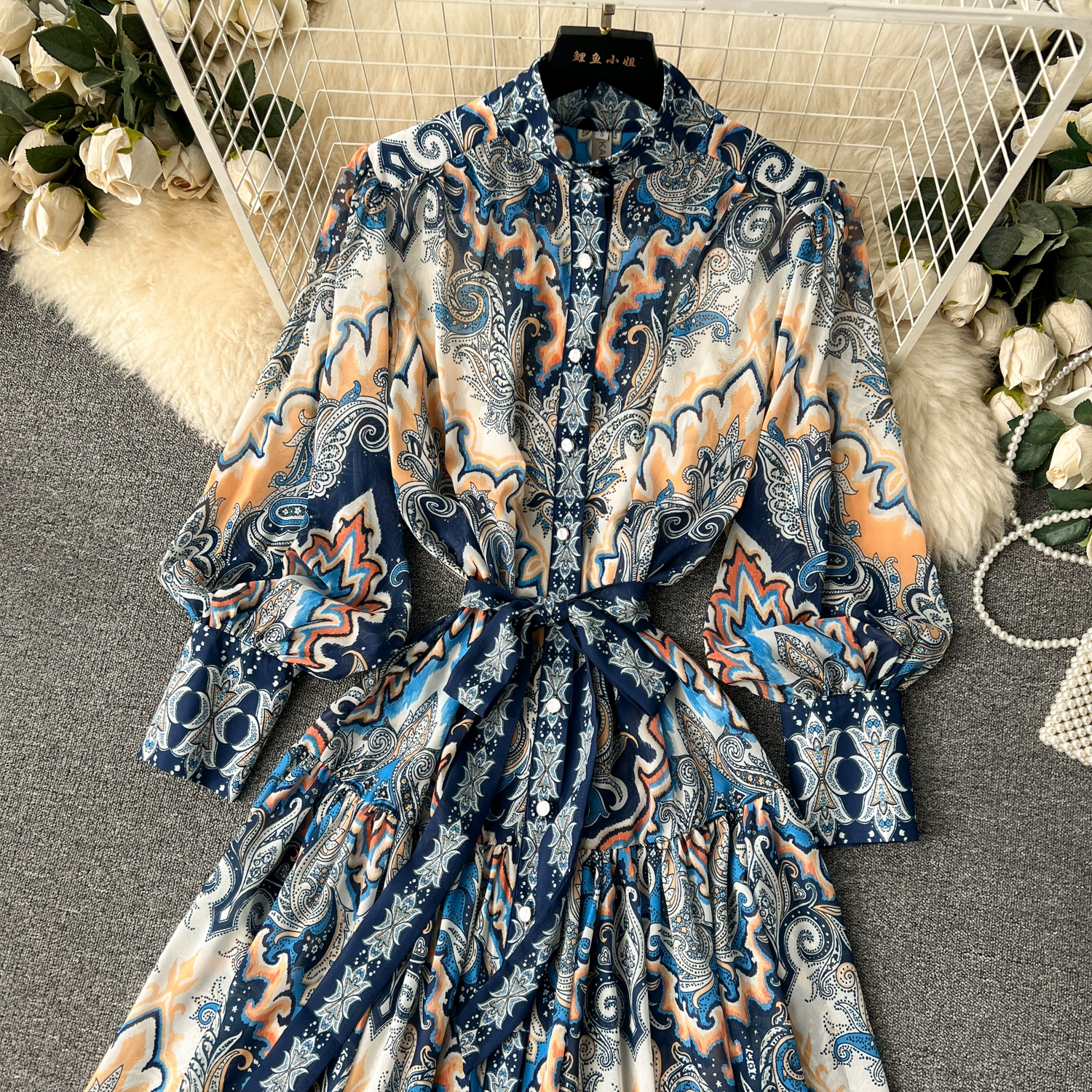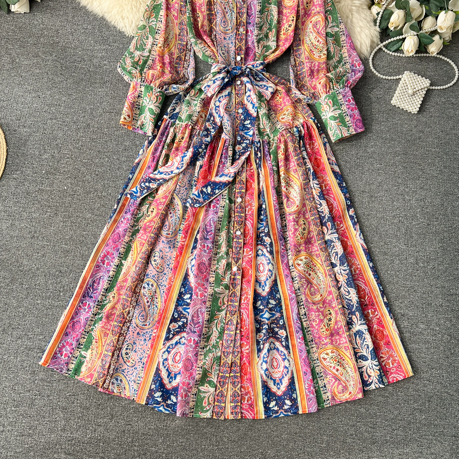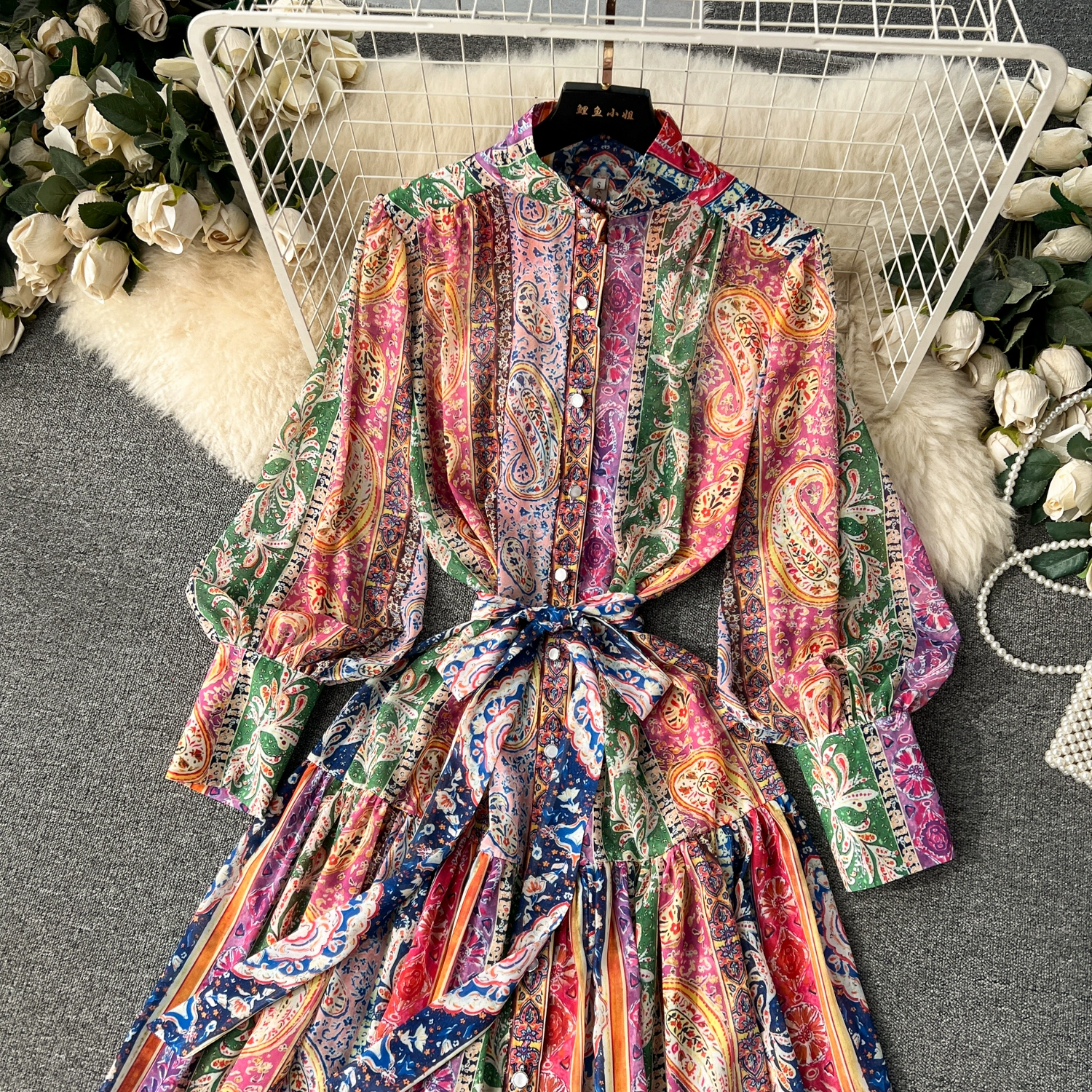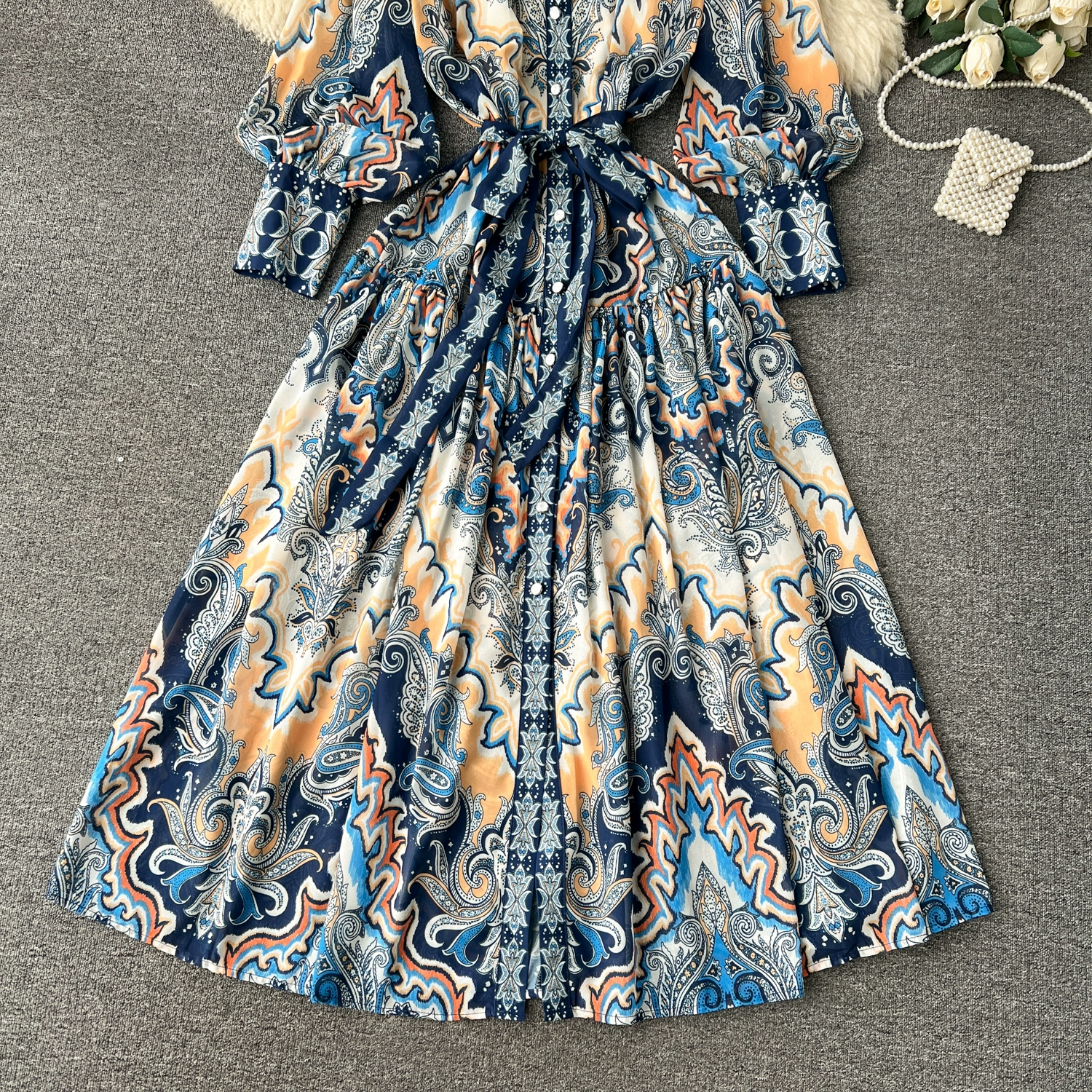 Fleepmart Spring Holiday Paisley Maxi Dress Women Clothing Turleneck Long Lantern Sleeve Flower Retro Print Belted Chiffon Loose Vestidos