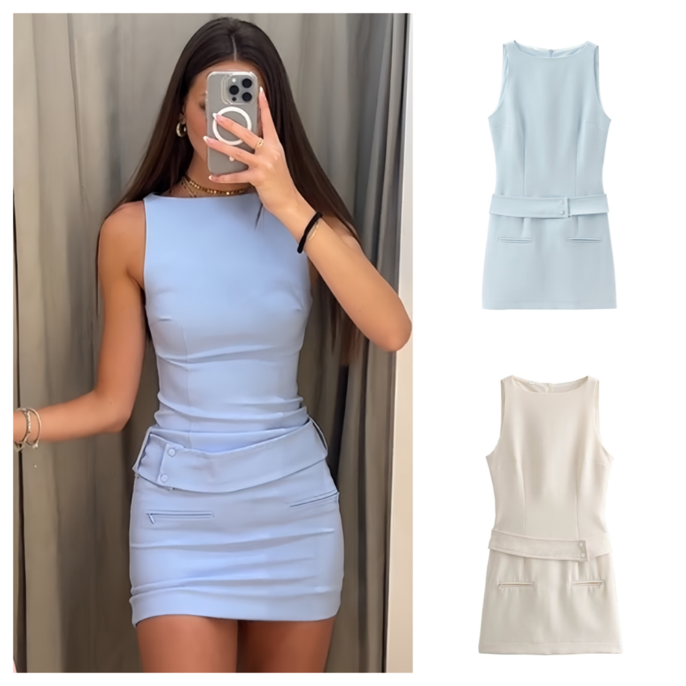 Fleepmart Spring New Women’s Fashion and Elegance Slim Fit Versatile Belt Decoration Round Neck Sleeveless Short Dress