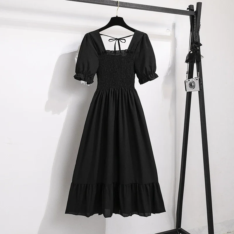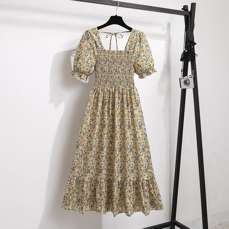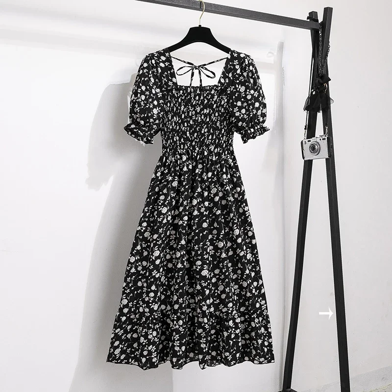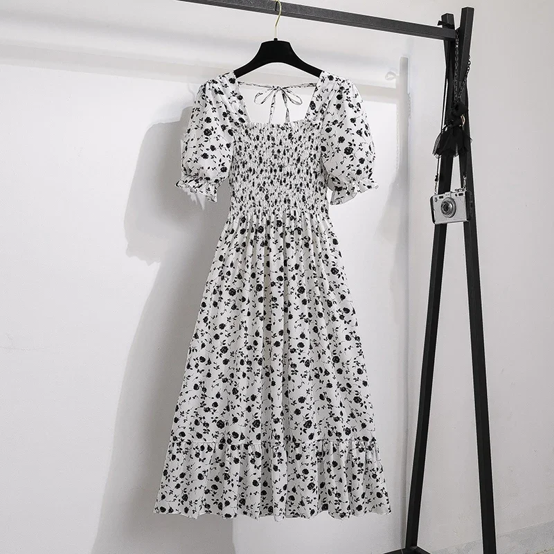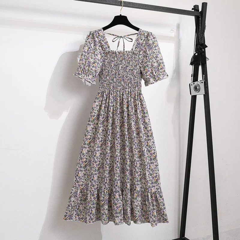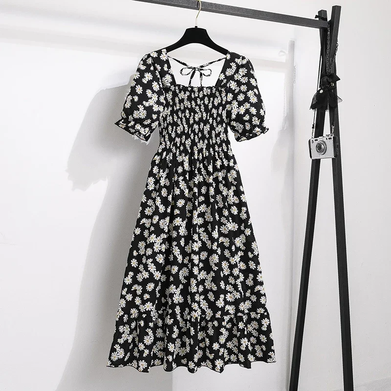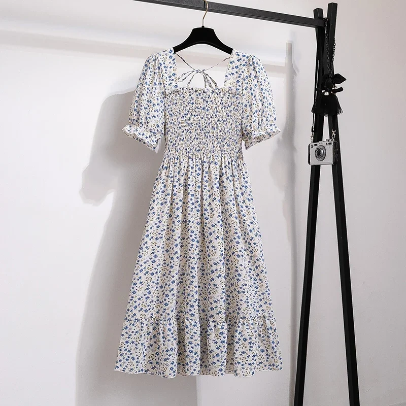 Fleepmart Spring Summer Chiffon Dresses Fashion Female Elastic Waist Short Sleeve Pleated Casual Dress Women A-line Dresses Vestidos