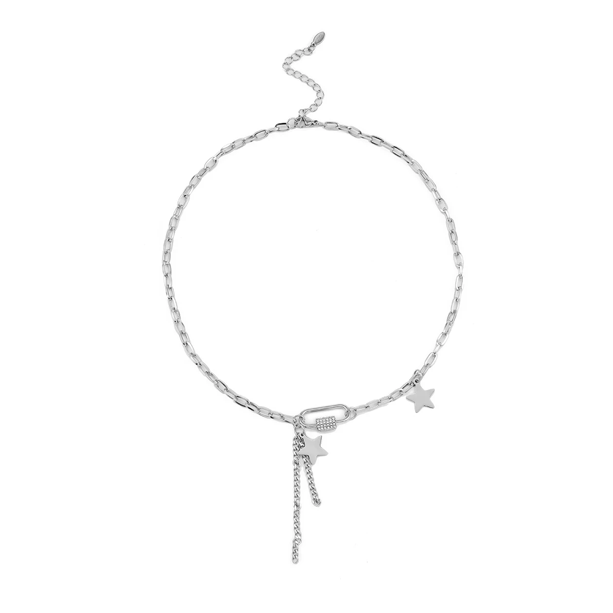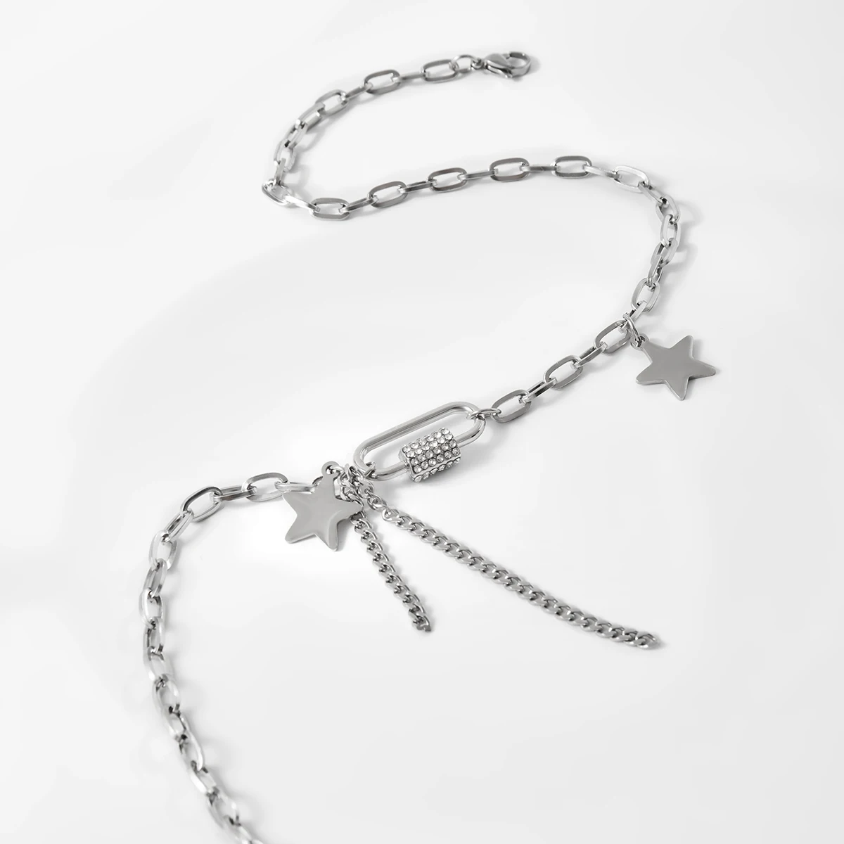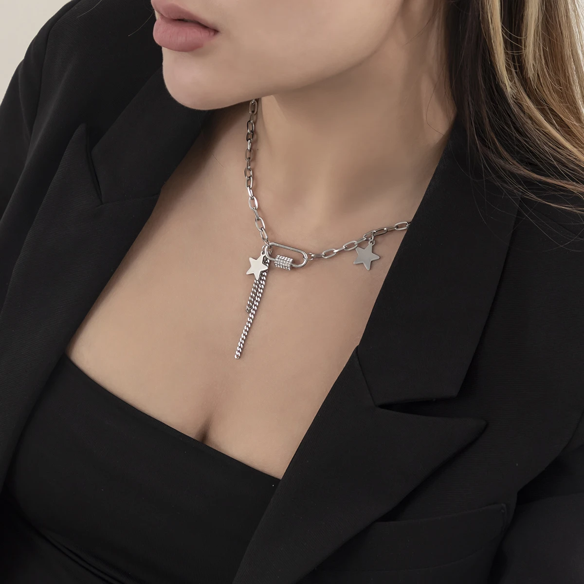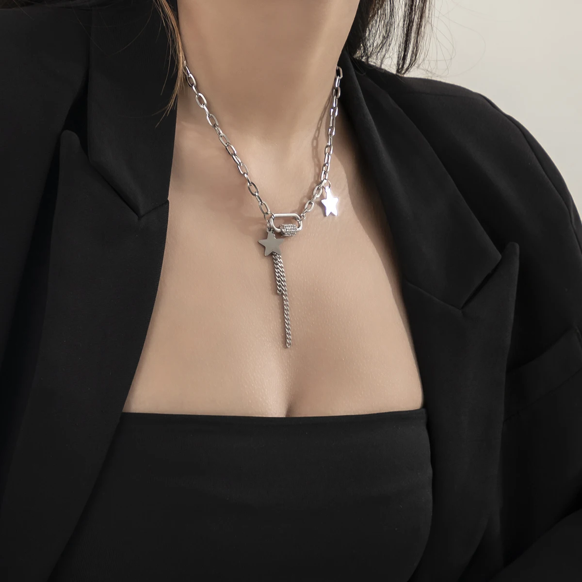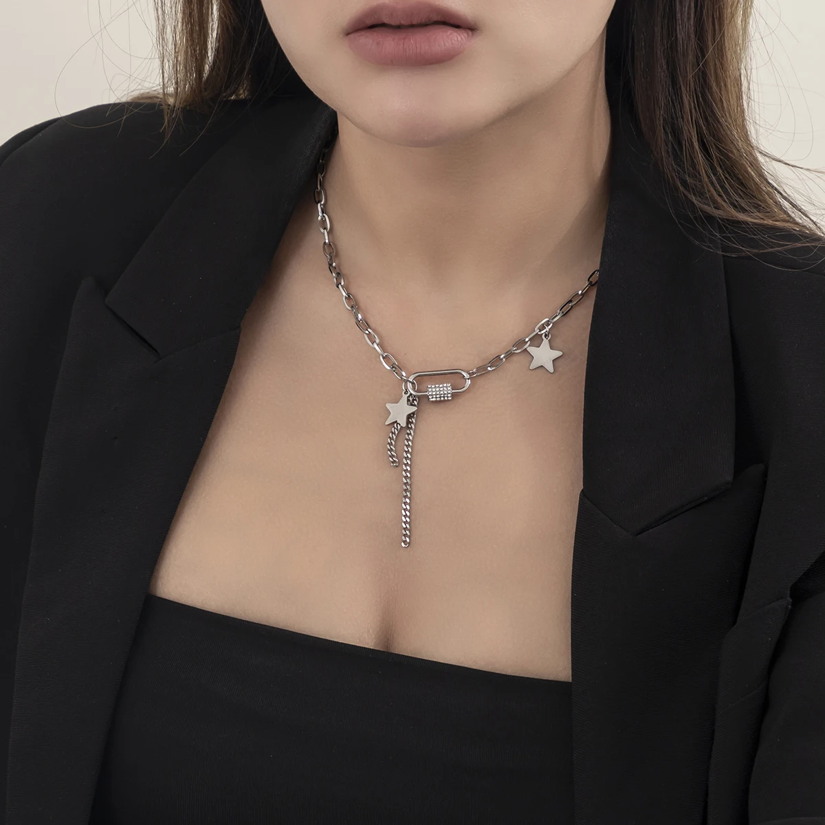 Fleepmart Stainless Steel Star Tassel Pendant Necklace for Women Men Minimalism Rhinestone Link Chain Necklace Korean Jewelry