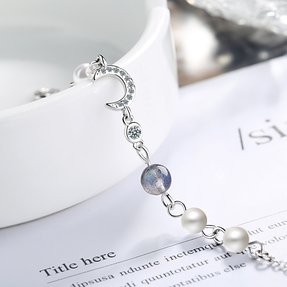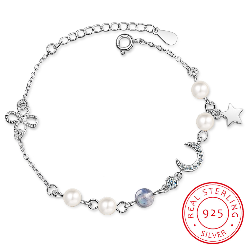 | Fleepmart Star Moon Charm Simple Wild Pearl 925 Sterling Silver Temperament Female Trendy Resizable Blue Moonstone Bracelets |