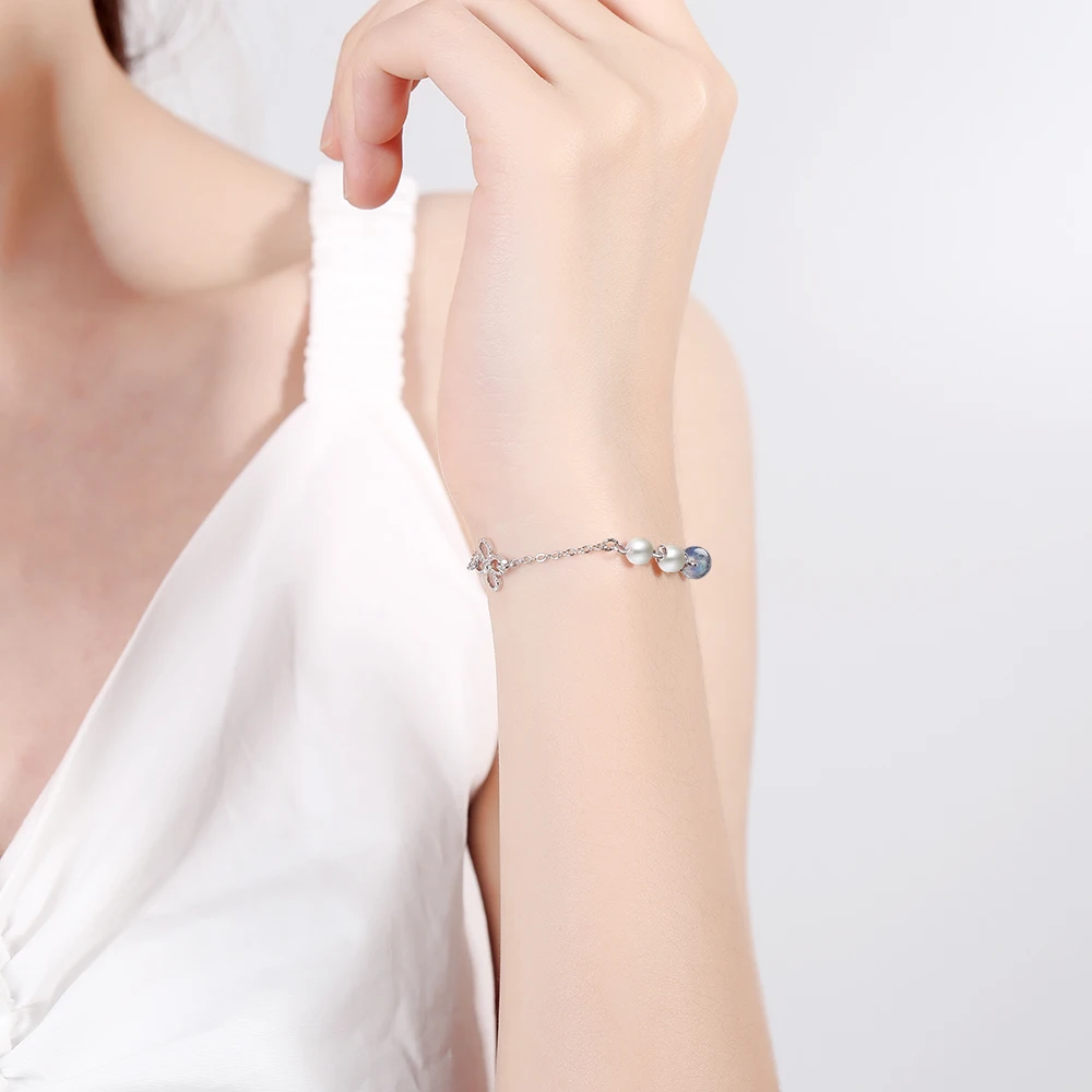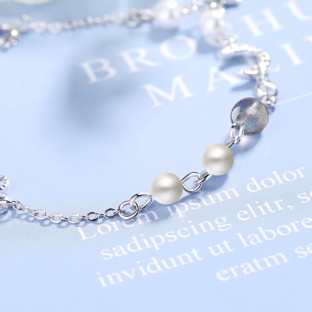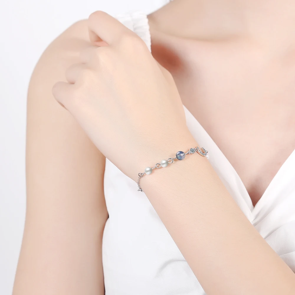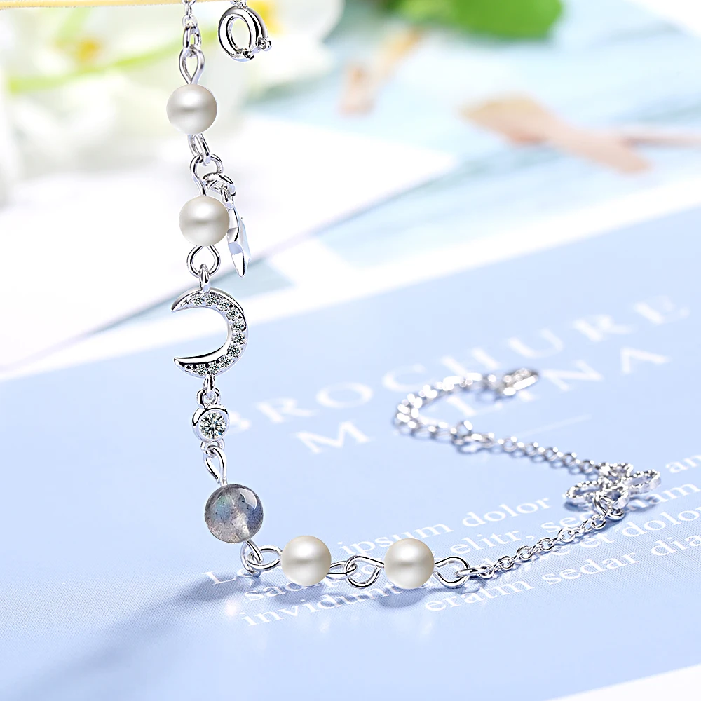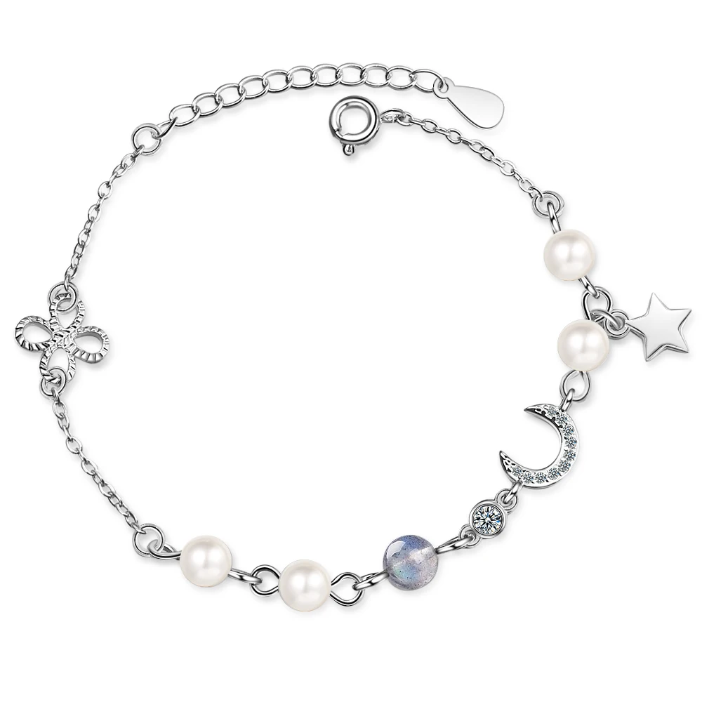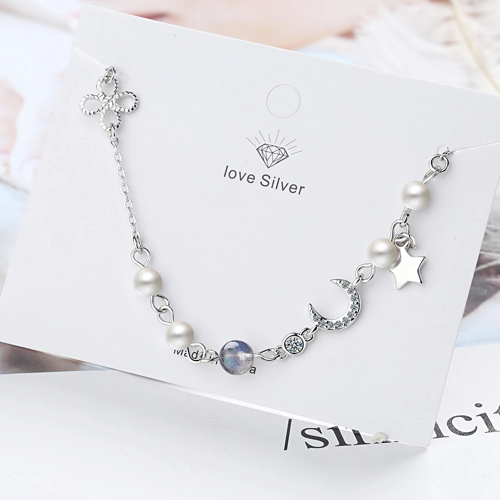 | Fleepmart Star Moon Charm Simple Wild Pearl 925 Sterling Silver Temperament Female Trendy Resizable Blue Moonstone Bracelets |