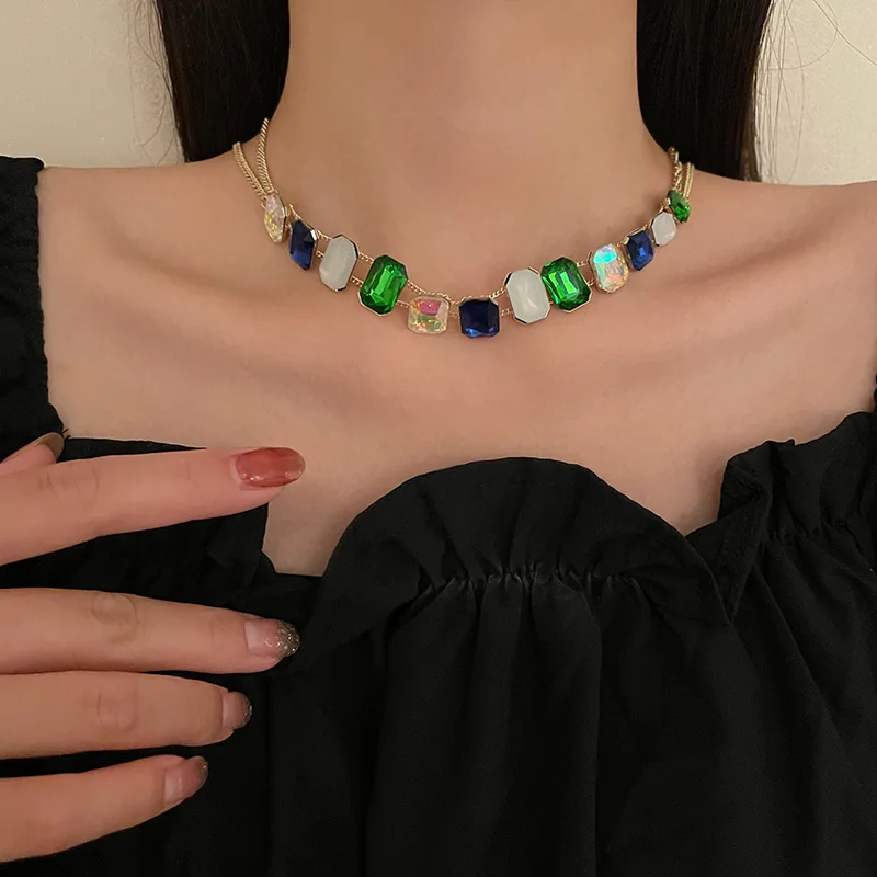 fleepmart Statement Green Mixed Color Crystal Choker Necklace For Women Personality Classic New Jewelry