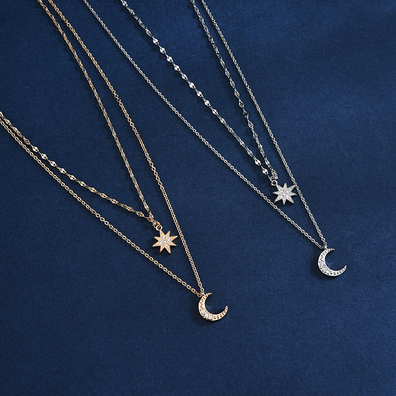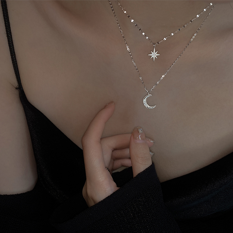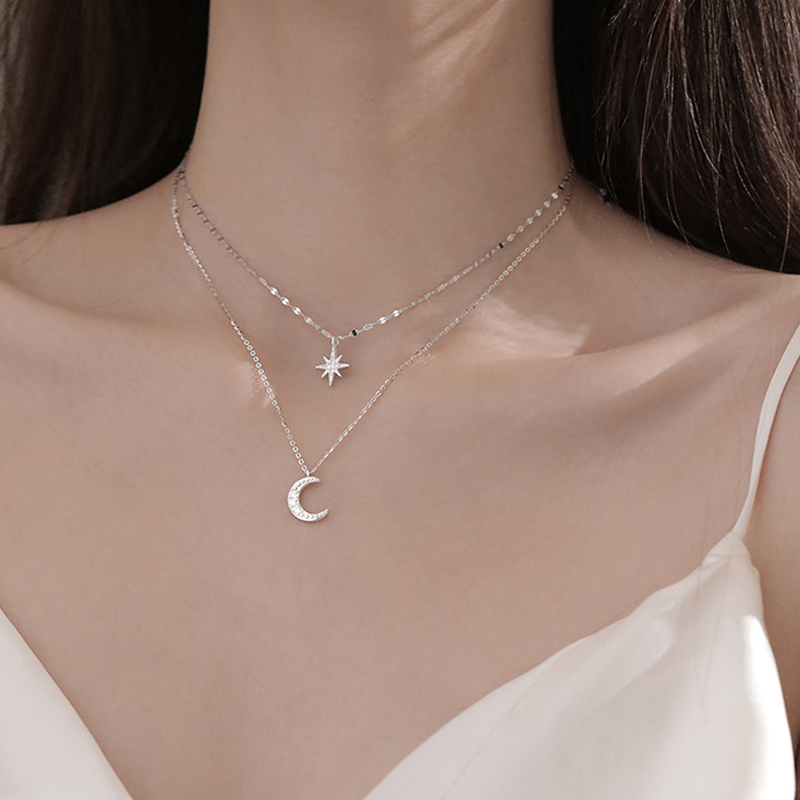 Fleepmart Sterling Silver Double Layer Simple Stars Choker Shiny Zircon Moon Pendants Necklaces Girl Gift Fine Accessories